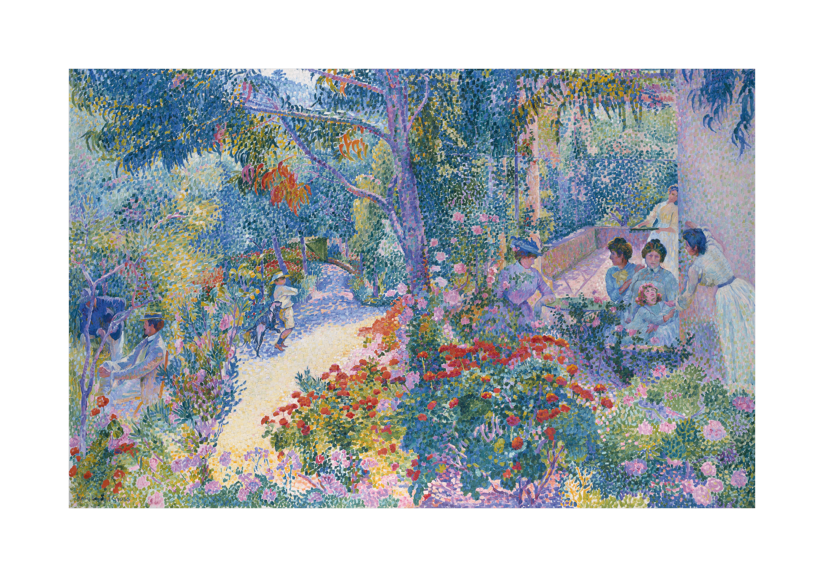 色とりどりの花が咲く庭園のポスターです。赤、ピンク、黄色の花々と、青や緑の葉を持つ木々が描かれています。点描画法で描かれた美しい午後の風景が、お部屋を明るく彩ります。