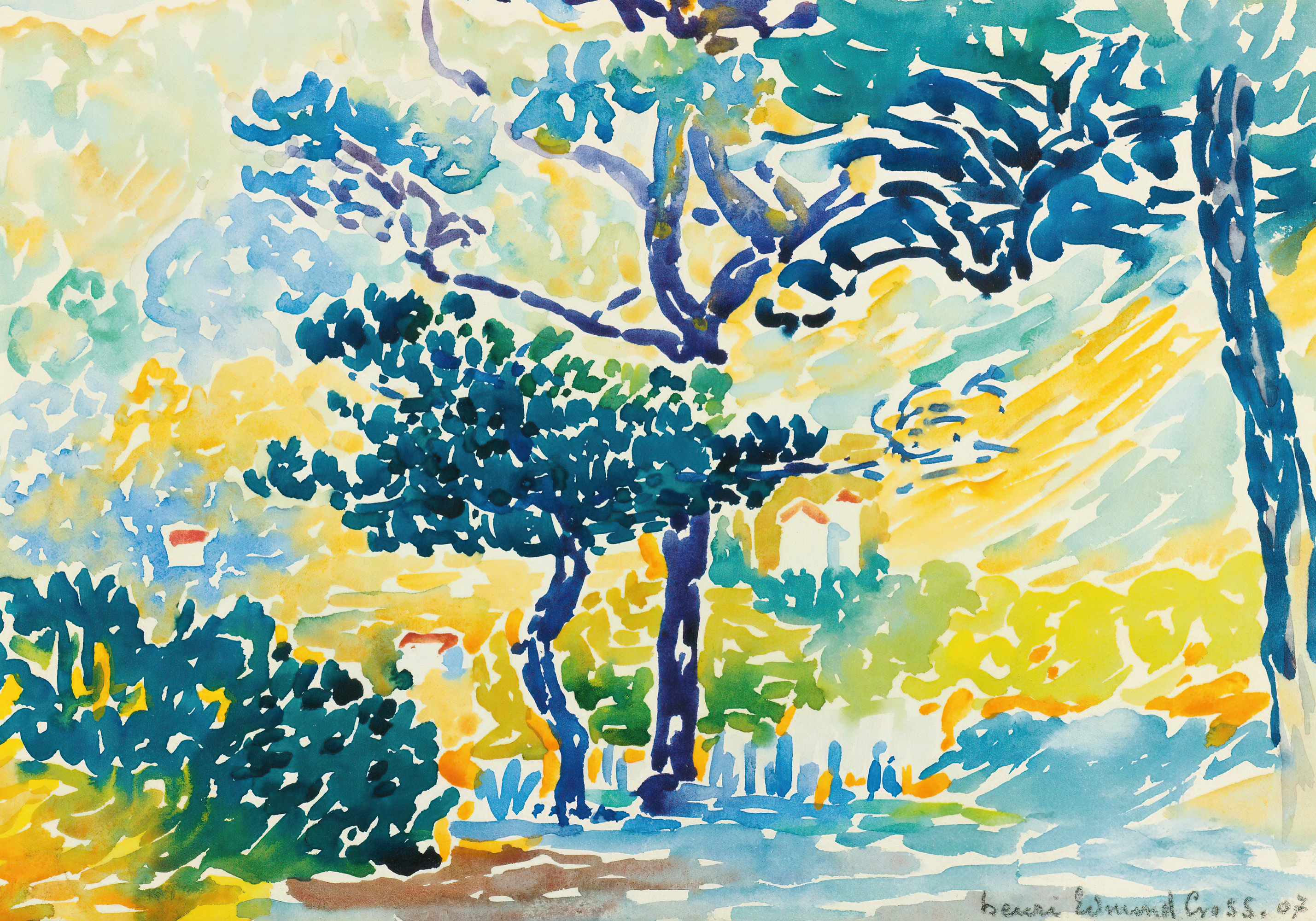 色とりどりの水彩画で、抽象的な木々が描かれています。緑、青、黄色が画面を彩ります。濃い青の幹と枝が伸び、葉は青と緑の点で表現されています。黄色が太陽の光を感じさせます。背景には赤い屋根の小さな家も見えます。自由な筆のタッチが生き生きとした雰囲気を作り出すポスターです。