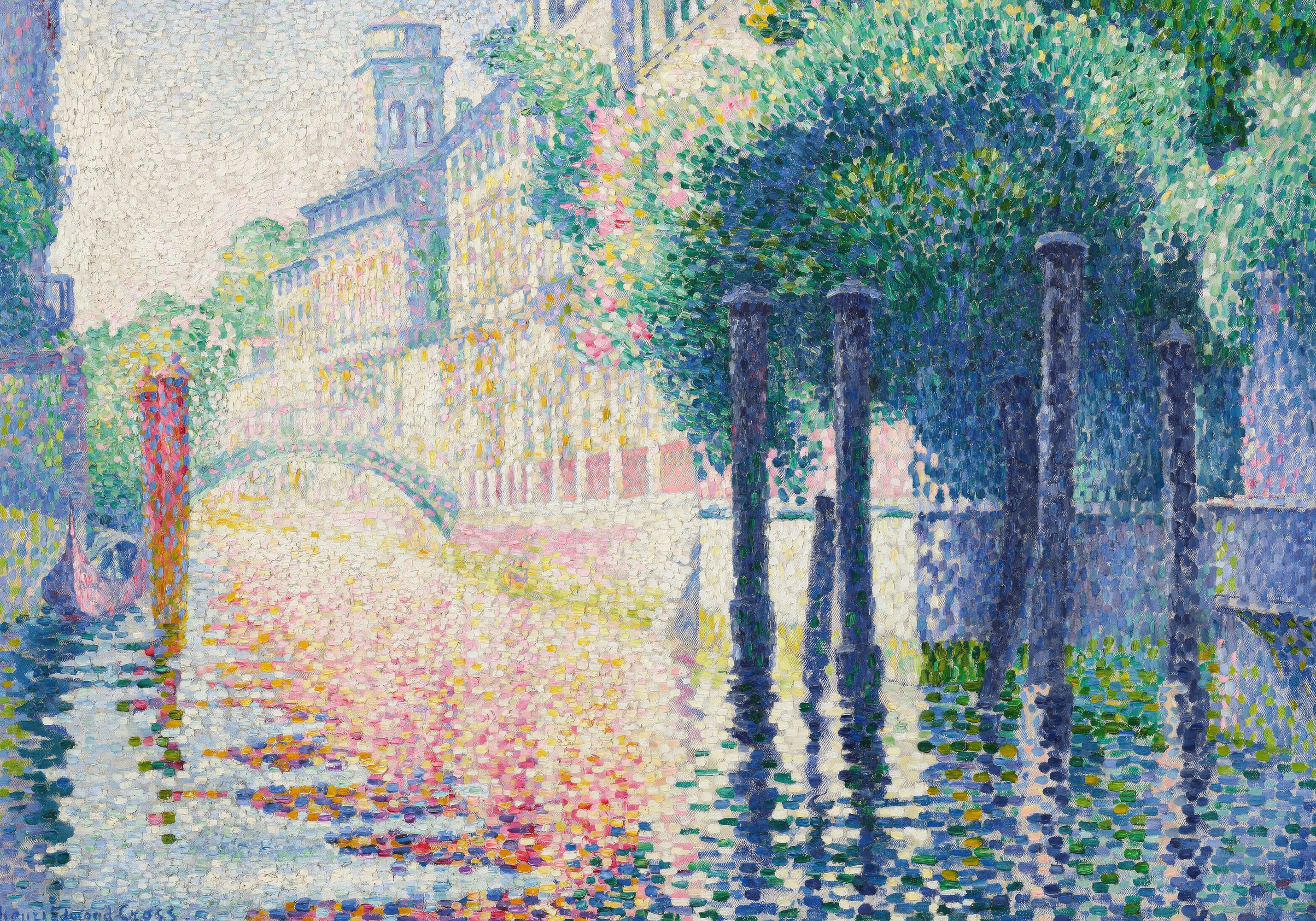 運河と橋、建物が描かれたカラフルなポスターです。水面にはピンク、黄色、青が映り込んでいます。右側には緑と青の木々があり、水中には背の高い黒い杭が立っています。空は明るく、柔らかな青と白で描かれています。