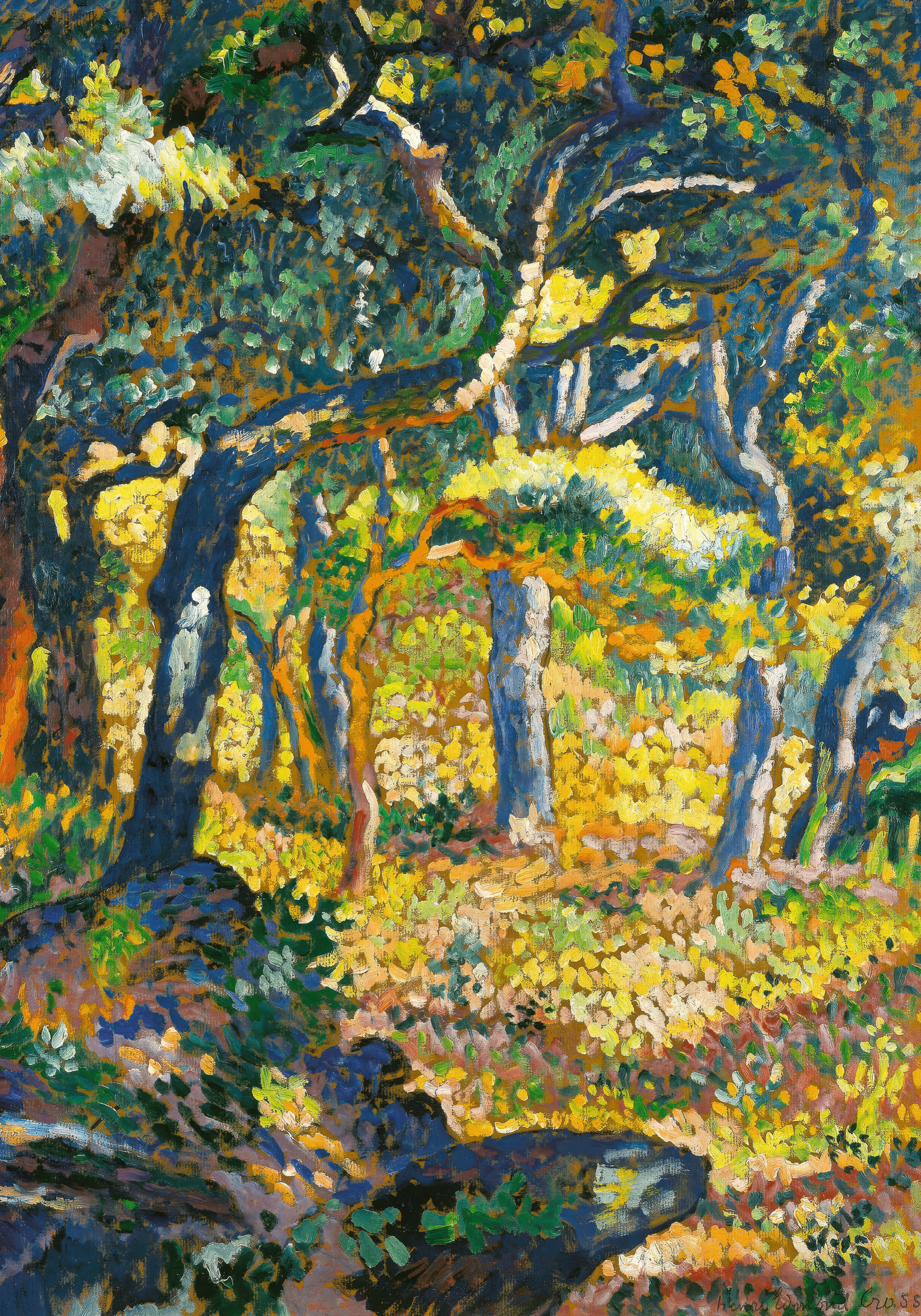 太い幹と曲がりくねった枝を持つ木々が描かれています。葉は明るい黄色、緑、青で彩られ、光が葉の間から差し込んでいます。地面には色とりどりの植物が広がり、力強い筆のタッチが生き生きとした雰囲気を作り出しています。