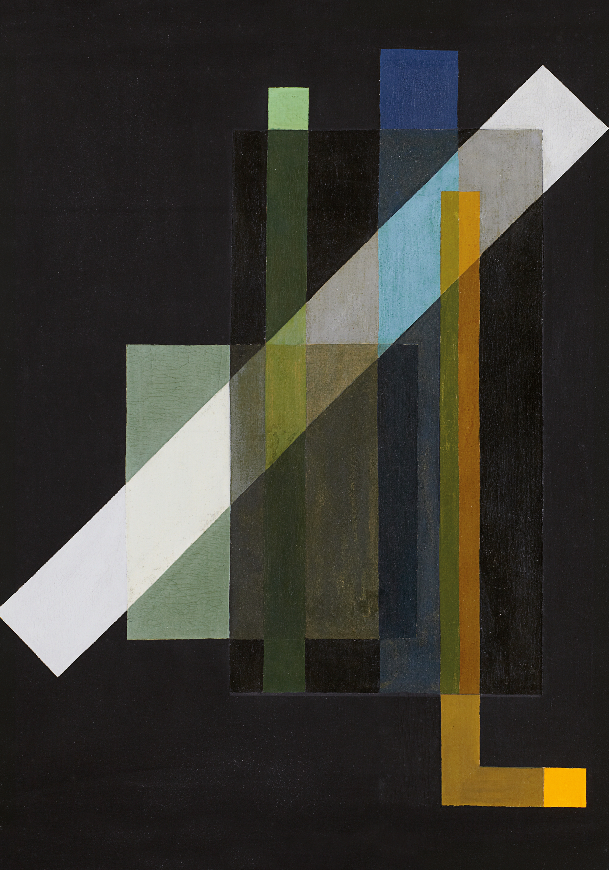 黒い背景に、白、緑、青、グレー、黄色、オレンジの四角形と線が重なり合う幾何学的なポスターです。シンプルで美しいデザインが、お部屋を明るく飾ります。