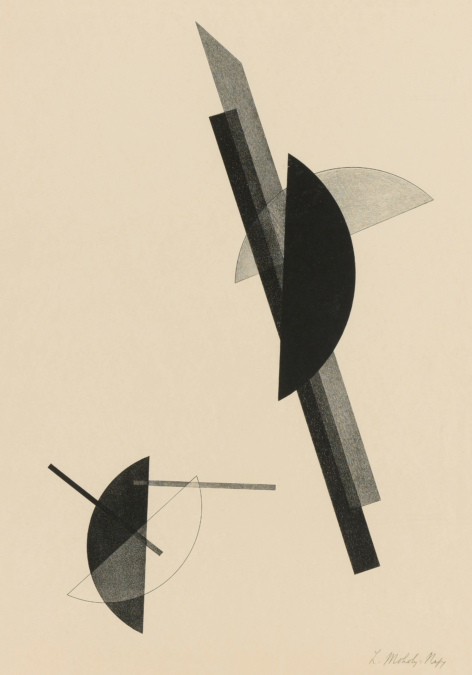 黒い半円と長方形が交わる幾何学的なポスターです。ベージュの背景に、グレーと黒の線が重なり合い、バランスの取れた抽象的なデザインを作り出しています。シャープな角度とコントラストが美しい一枚です。