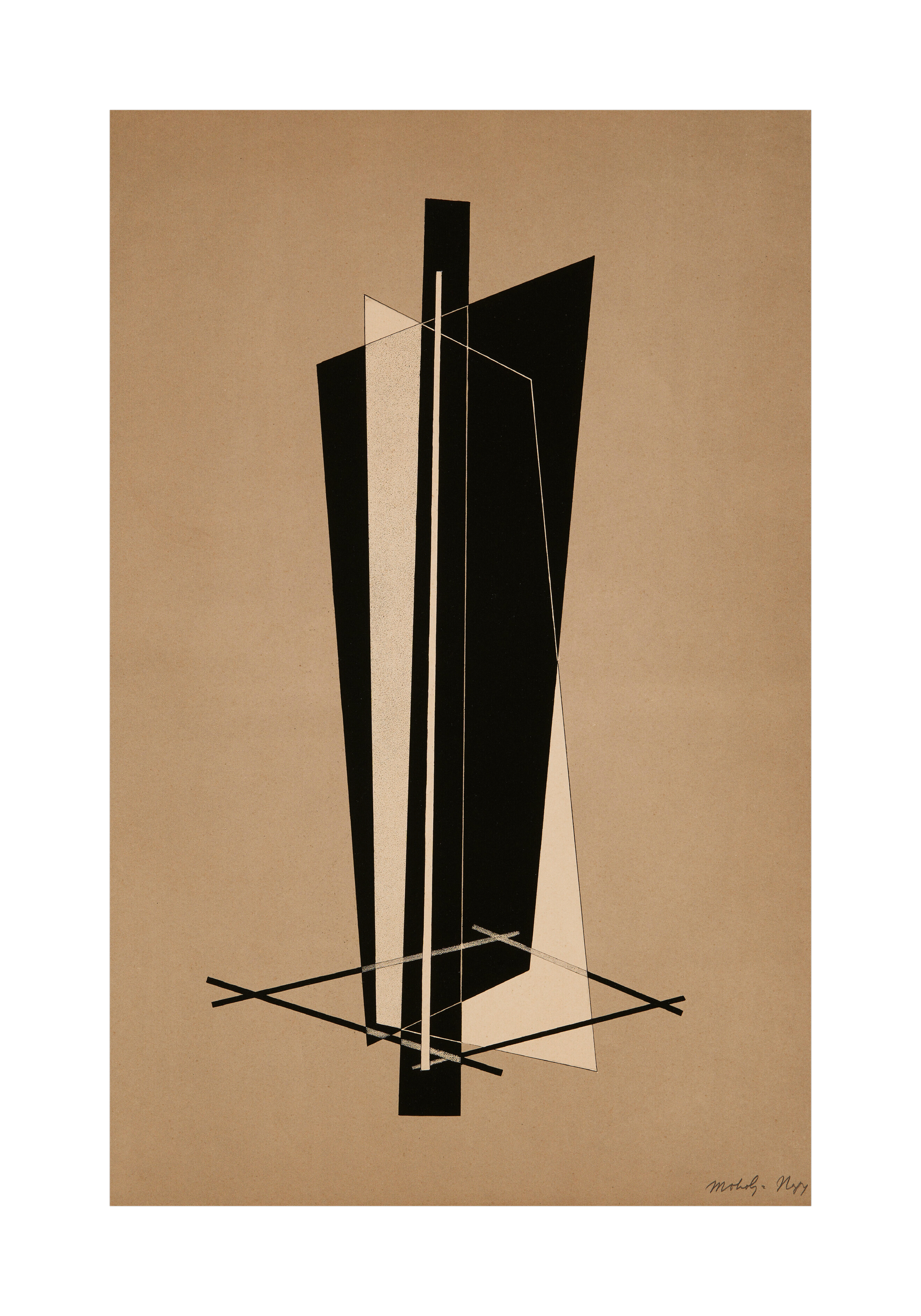 茶色の背景に黒とベージュの幾何学的な形が並ぶポスターです。シンプルで現代的なデザインが特徴です。
