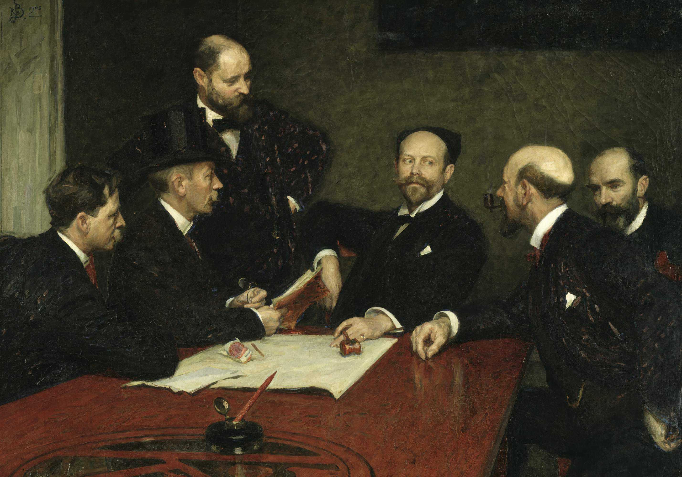 赤いテーブルを囲んで座る6人の男性たちを描いた歴史的なポスターです。フォーマルな雰囲気が漂います。