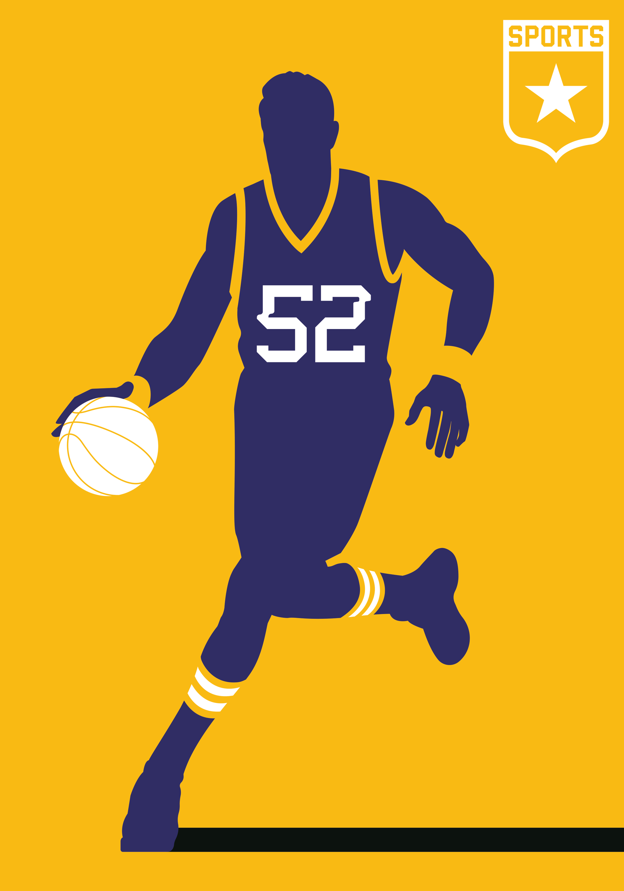 濃い青のユニフォームを着たバスケットボール選手のシルエットアートです。背景は明るい黄色で、選手は白いボールをドリブルしています。スポーツの力強さを感じるポスターです。