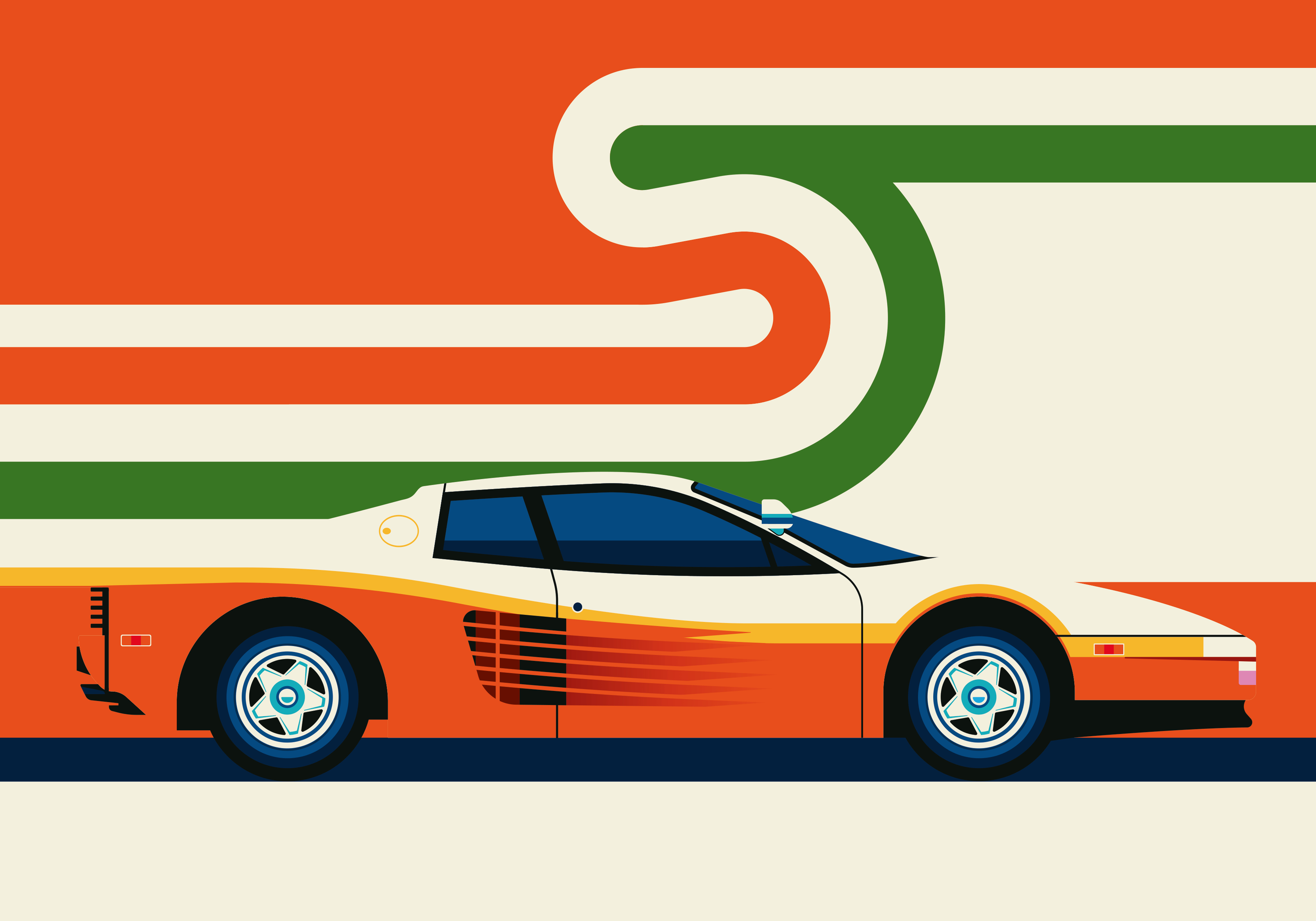 レトロなグラフィックスタイルで描かれた、白とオレンジのスタイリッシュな車のポスターです。カラフルなストライプの背景が魅力的です。