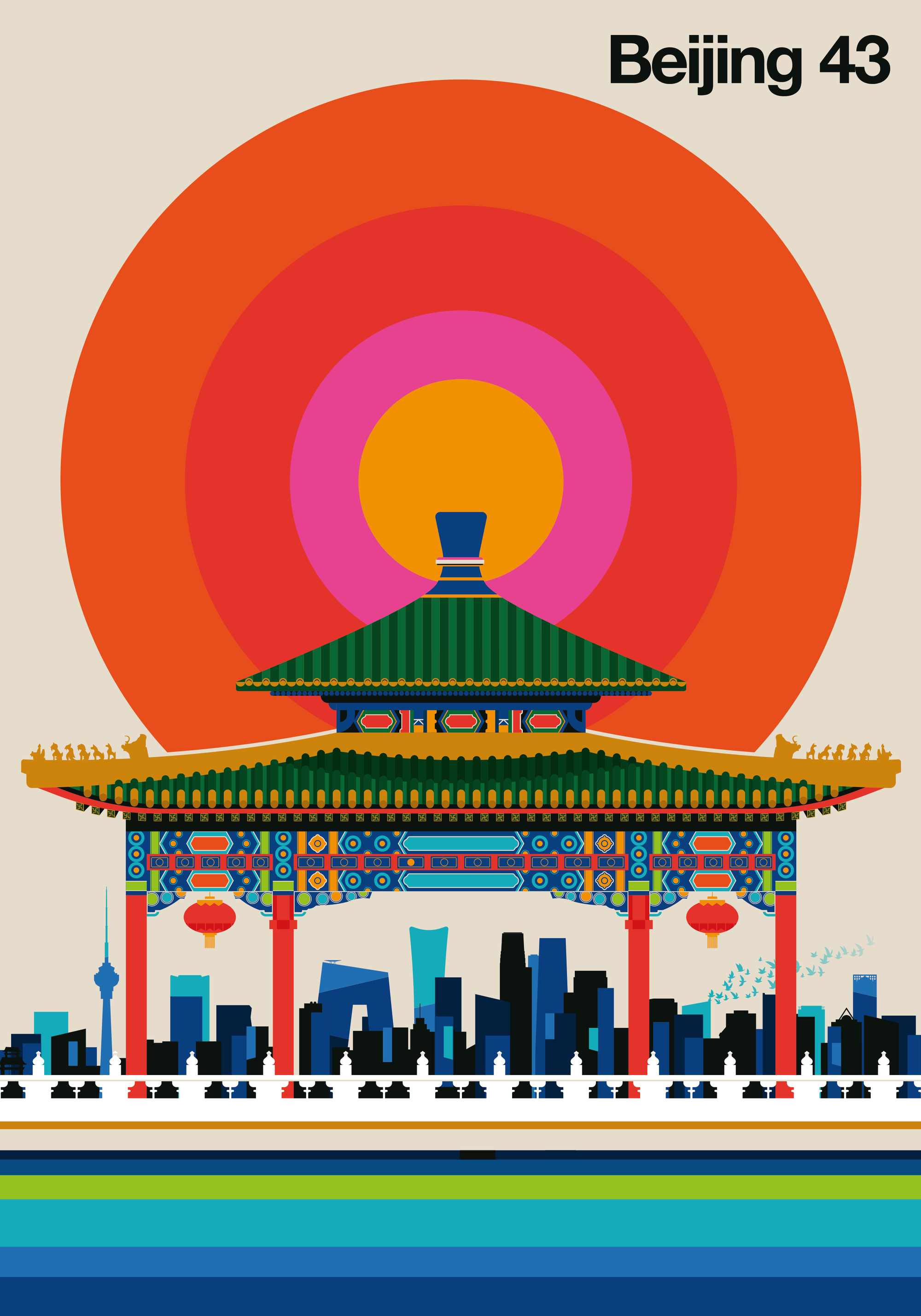 夕日が沈む北京の美しい景色を描いたポスターです。伝統的な中国の建物と街並みが、オレンジやピンクの温かい色で表現されています。