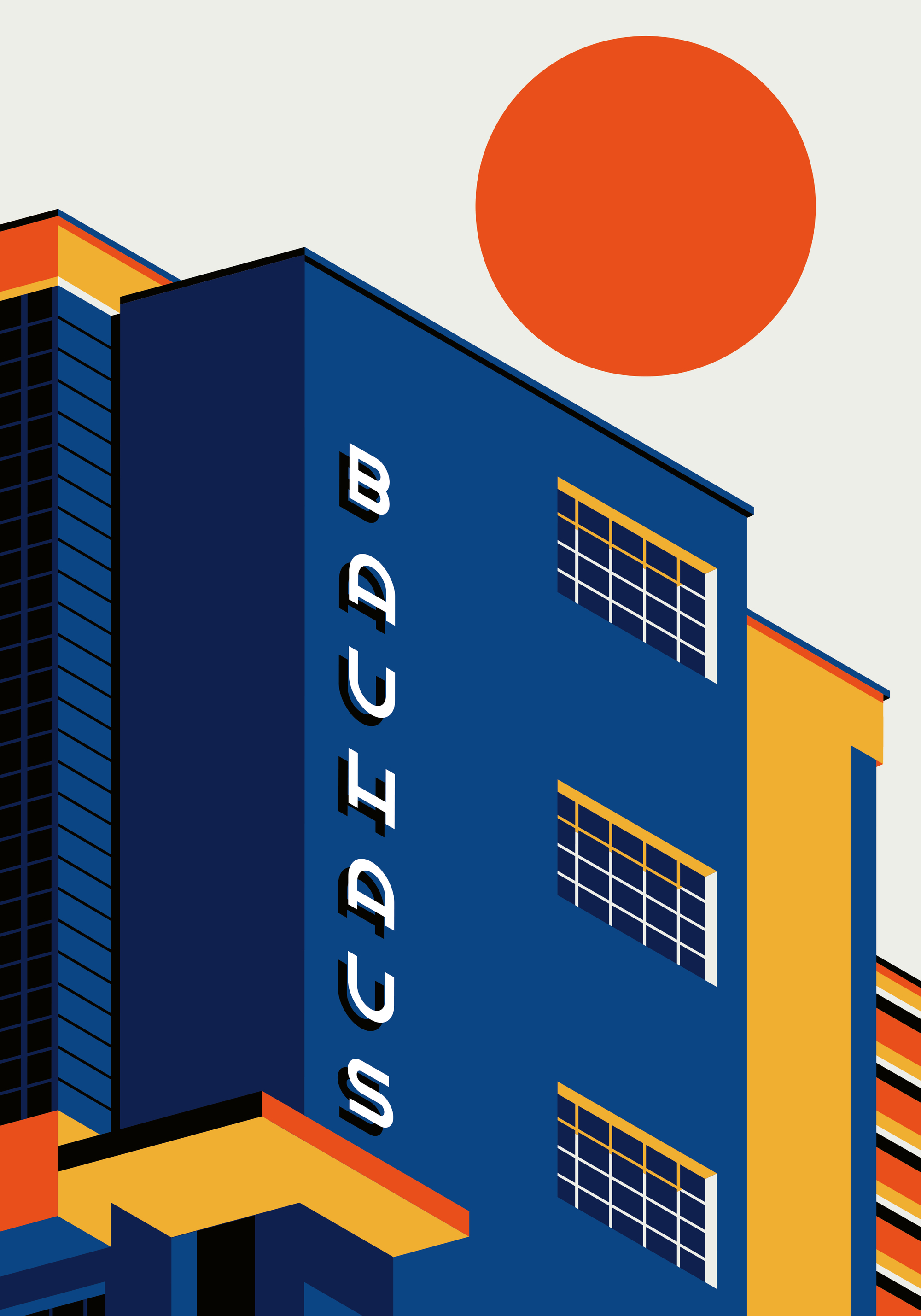 青い建物に「BAUHAUS」の文字が入った、カラフルでモダンなポスター。赤い太陽と幾何学的なデザインが特徴的で、お部屋を明るく彩ります。