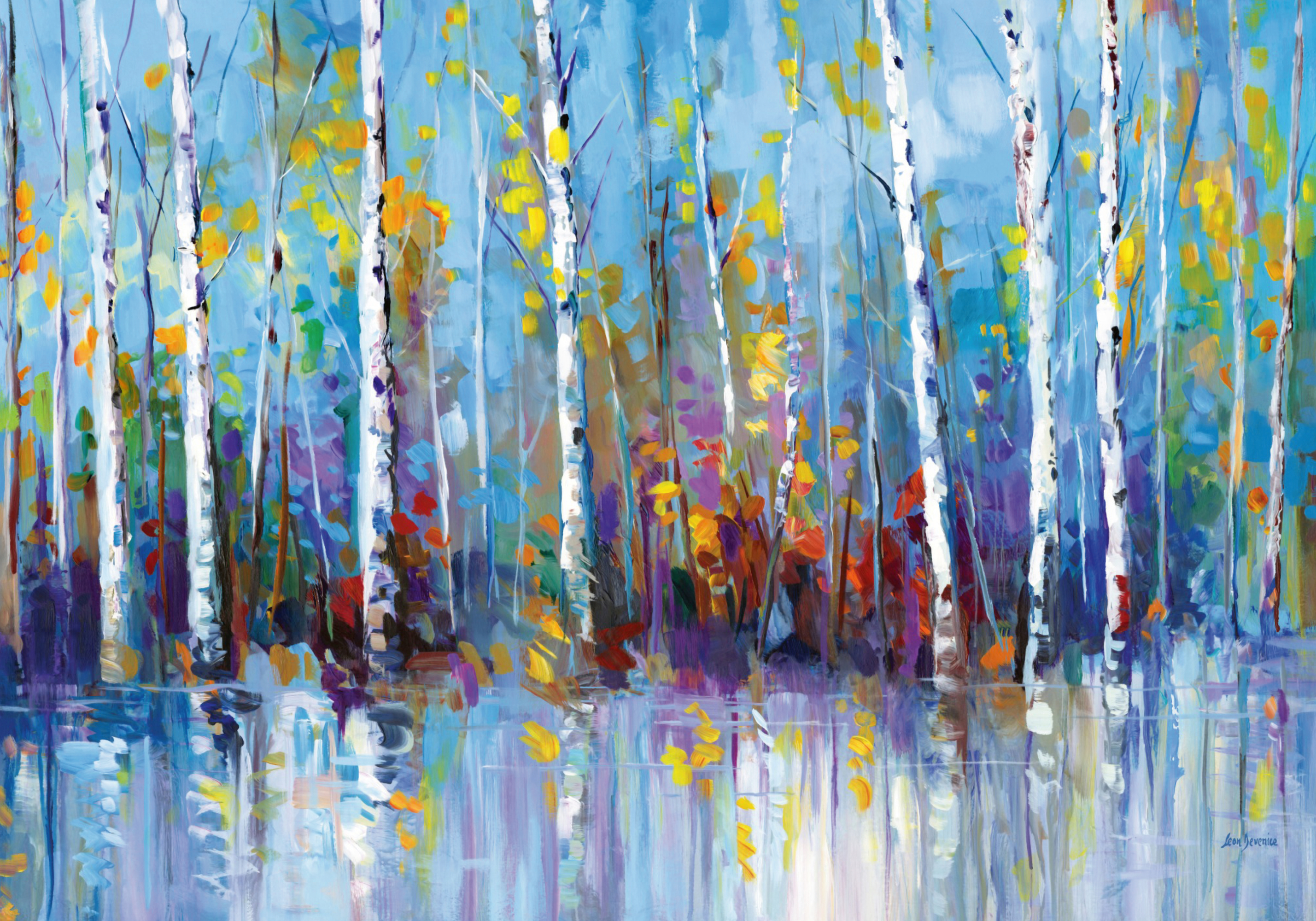 白樺の木と色鮮やかな葉が美しい森のポスターです。黄色、オレンジ、赤、緑の葉が明るい青空の下で輝きます。水面のような地面に木々が映り込み、やさしい雰囲気のアート作品です。