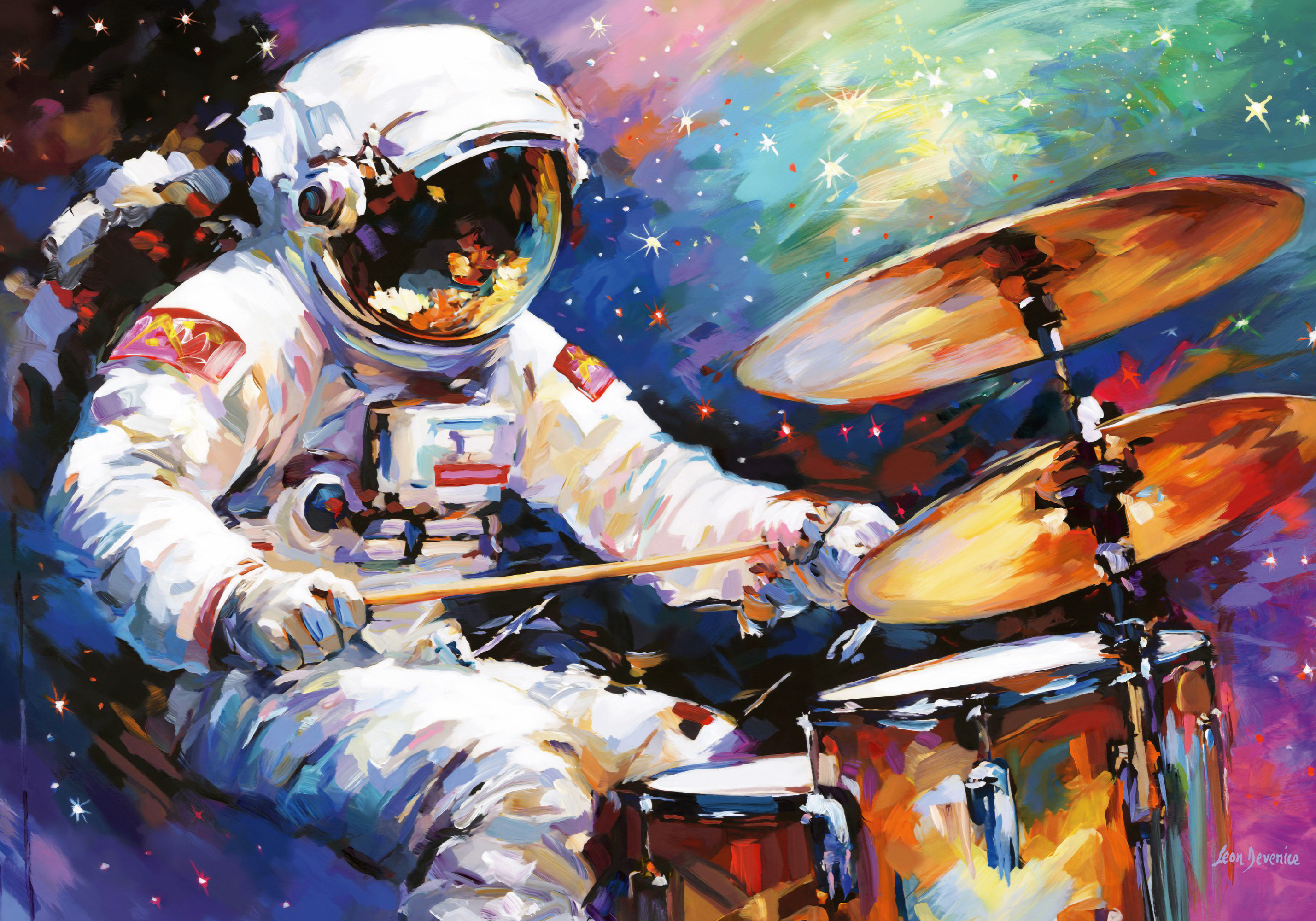 宇宙空間でドラムを演奏する宇宙飛行士のアートポスター。カラフルな星空と鮮やかなオレンジ色のドラムが印象的なポスターです。