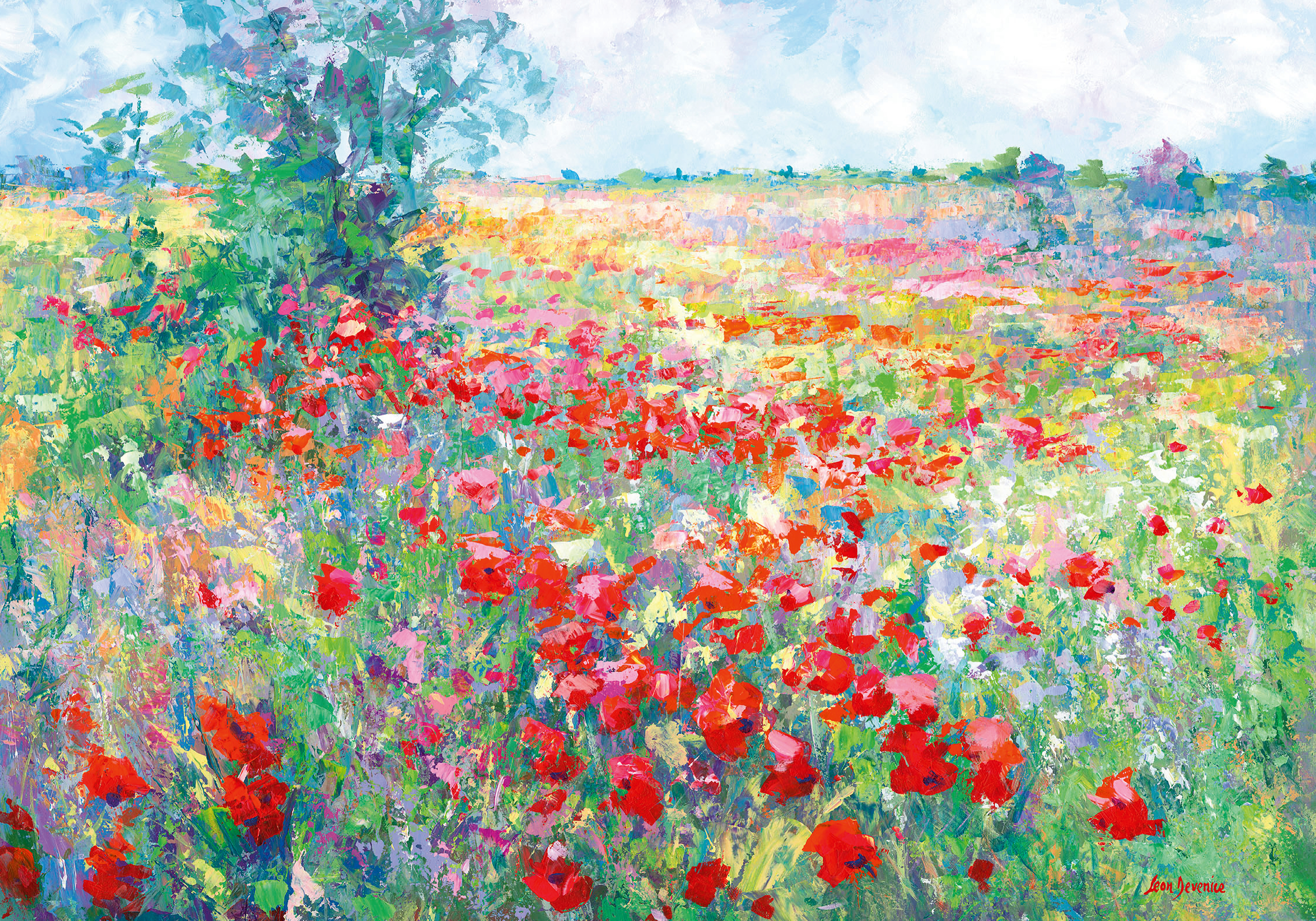 赤い花と緑の草が広がる明るい野原のポスターです。大きな木が左側に立っています。黄色、ピンク、紫の色が混ざった背景が美しいです。空は水色で白い雲が浮かんでいます。