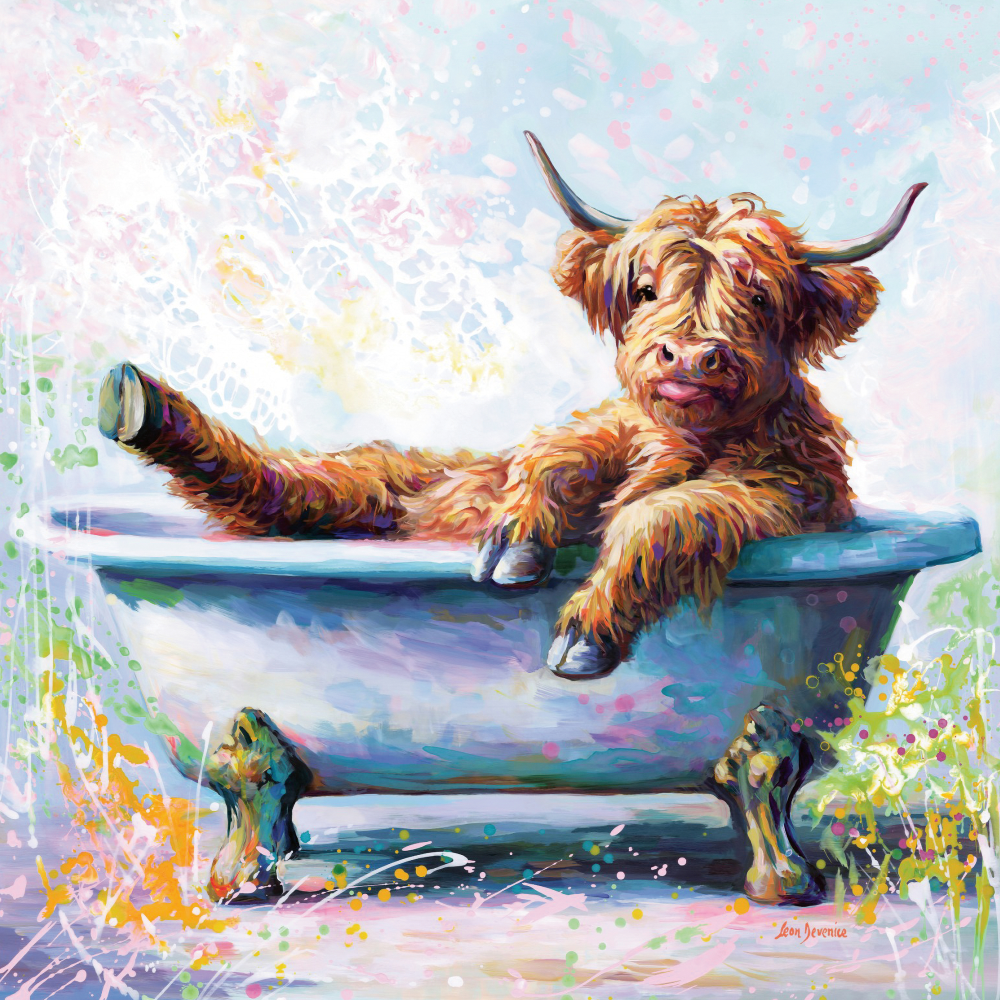 カラフルな背景の白いバスタブでくつろぐ、ふわふわの茶色い牛の赤ちゃん。ピンク、青、緑、黄色が明るく楽しい雰囲気を作ります。