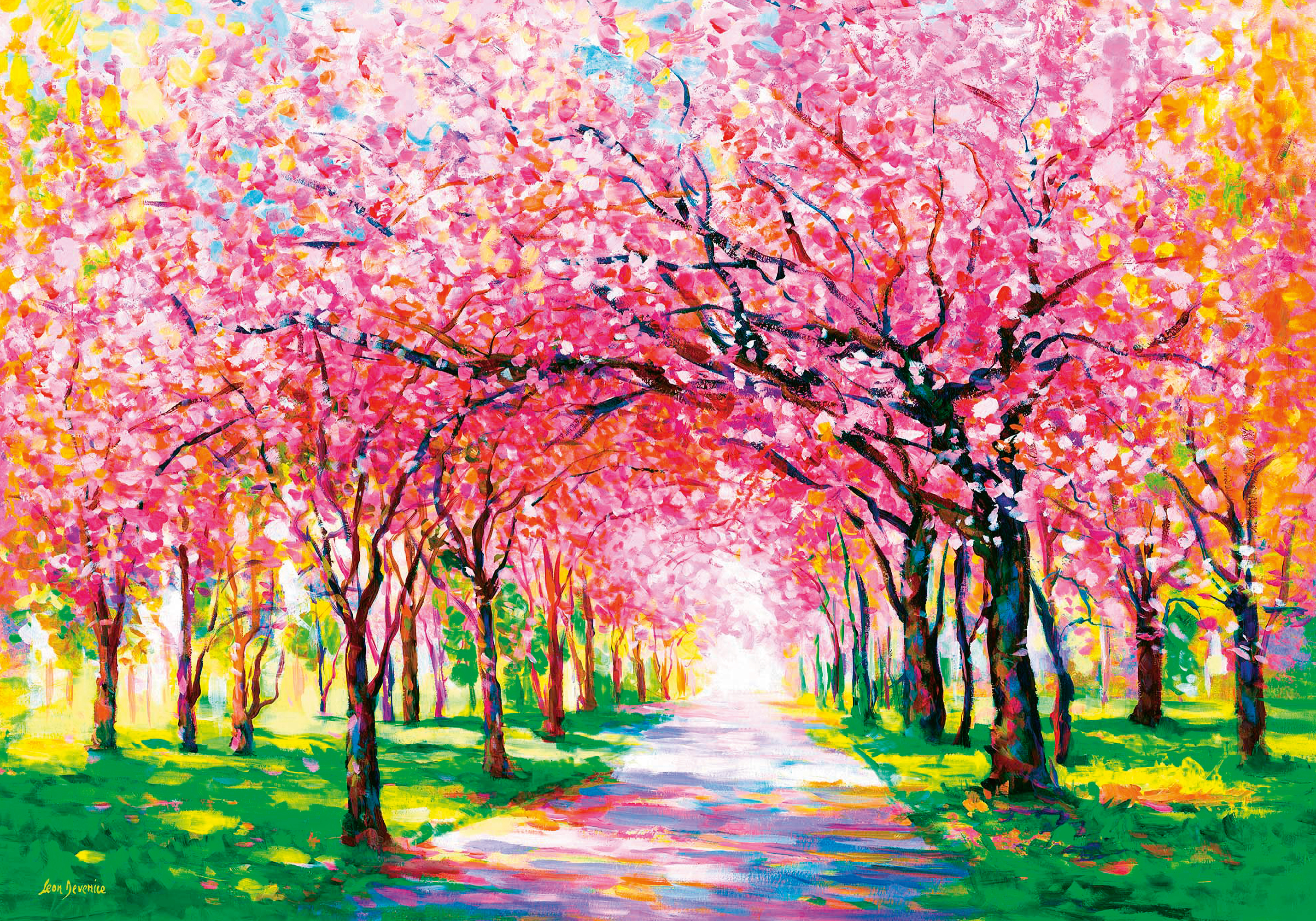 ピンクと赤の花が咲く木々が並ぶ、明るい小道のポスターです。太陽の光が優しく差し込み、美しい色合いを作り出しています。