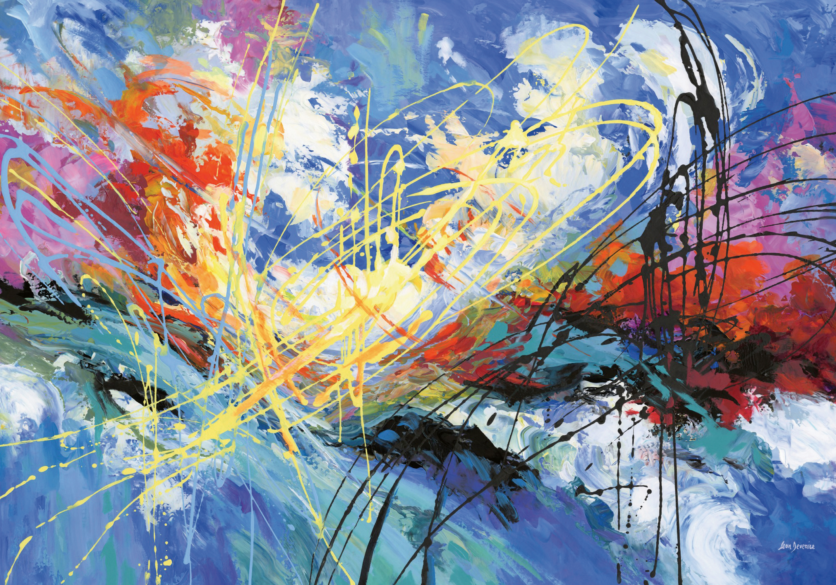明るくて元気な抽象画のポスター。青と紫の背景に、赤、オレンジ、白が飛び散ります。黄色と黒の線が力強く交差し、活気あふれる作品です。