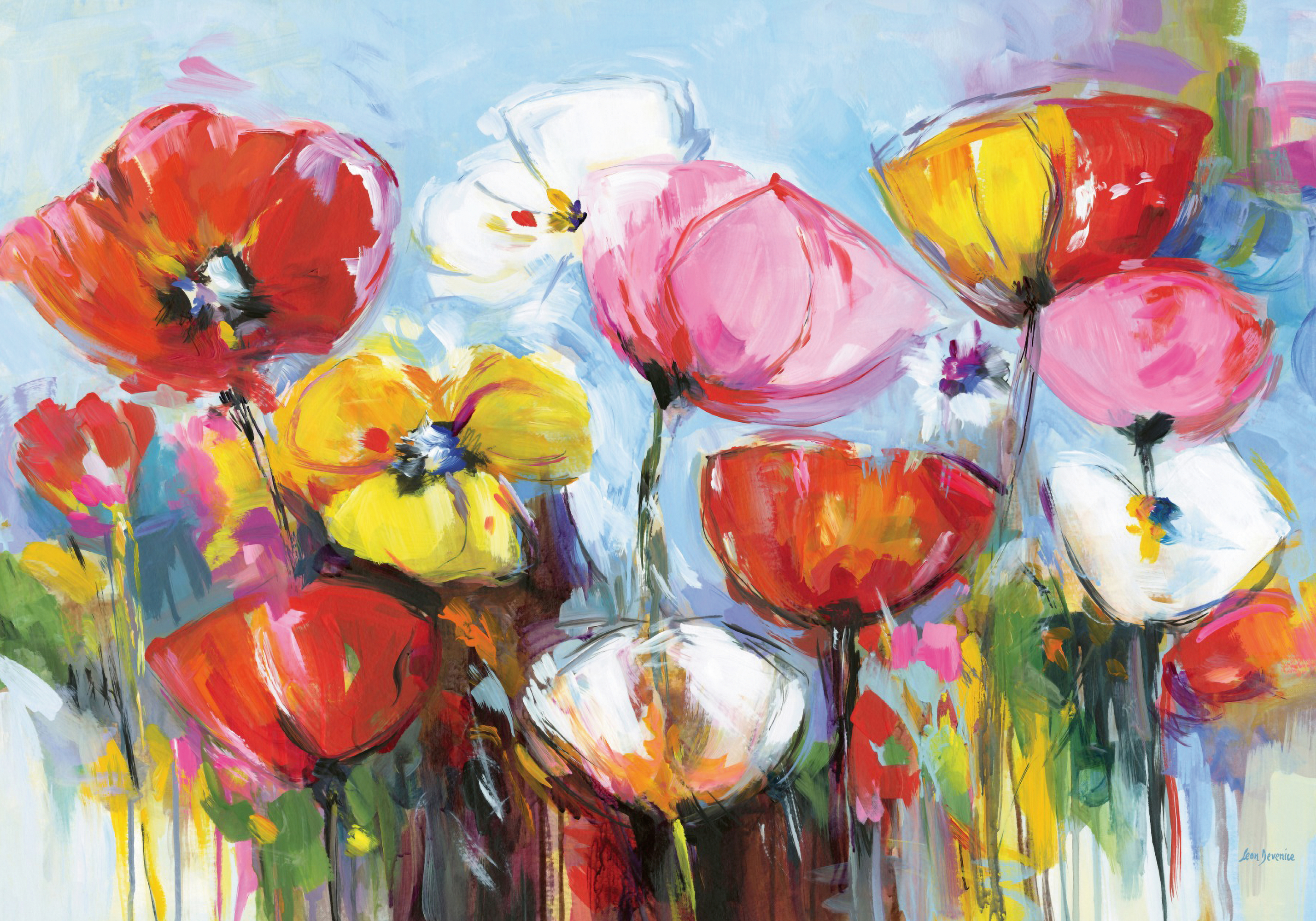 赤、ピンク、黄色、白の花びらが明るい青い背景に映える、カラフルで楽しい花のポスターです。力強い筆づかいが生き生きとした動きを生み出します。