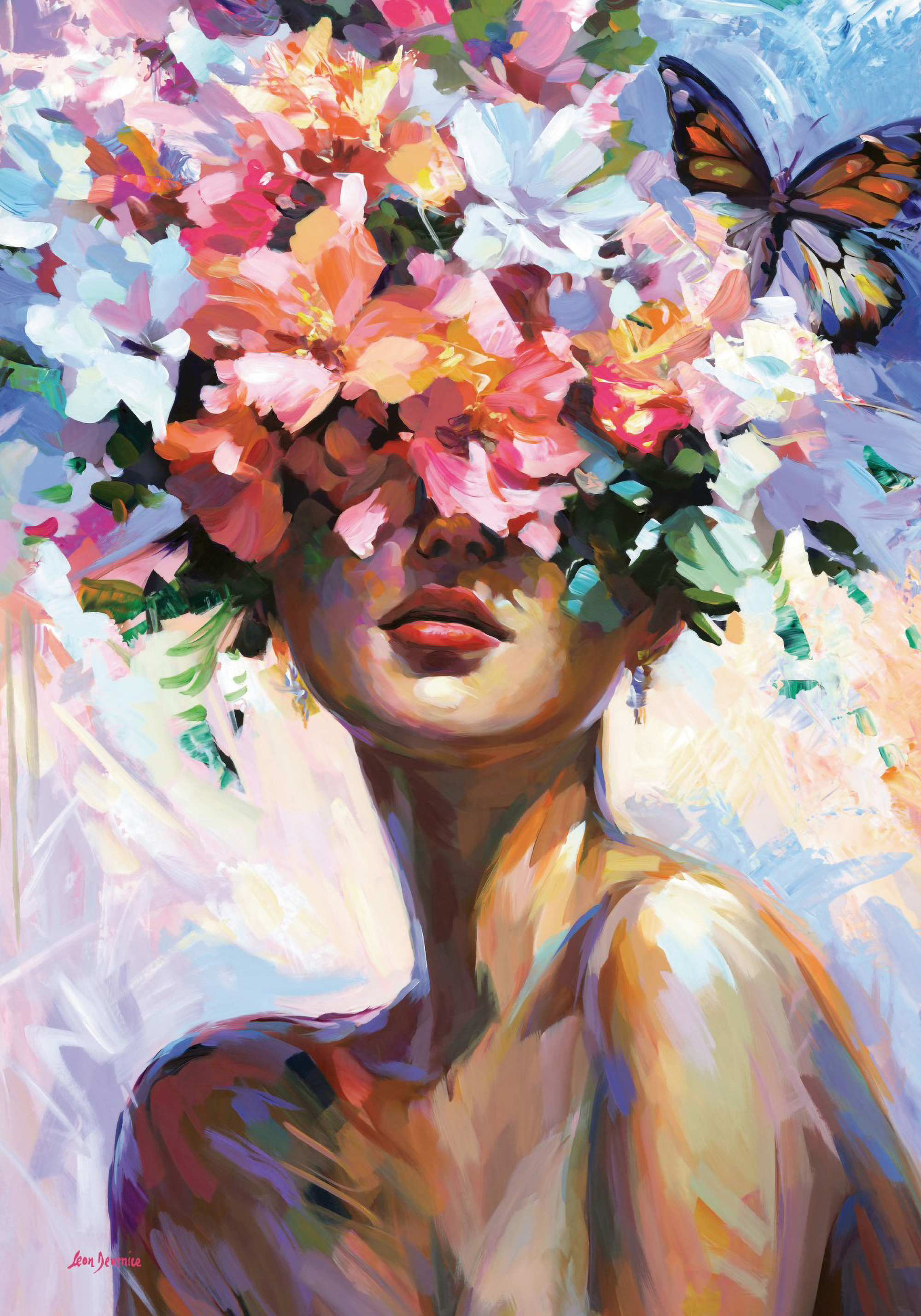 カラフルなお花に囲まれた女性のポスター。ピンク、オレンジ、白、グリーンの優しい色合いと蝶々が素敵なアートです。