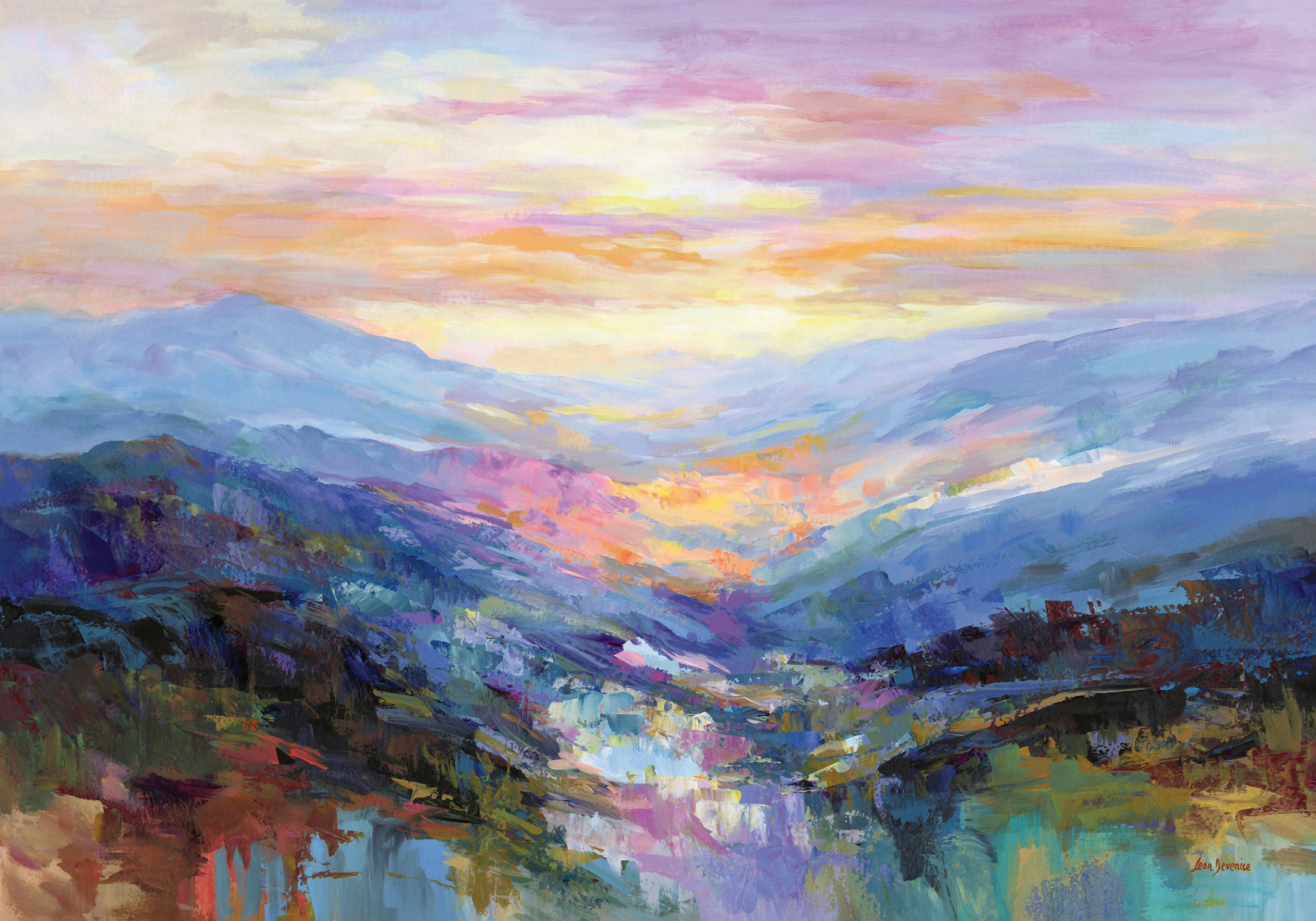 柔らかなピンク、オレンジ、イエローの空が美しい山の風景ポスター。青と紫の山々に緑と茶色が混ざり合い、夢のような雰囲気を作り出します。