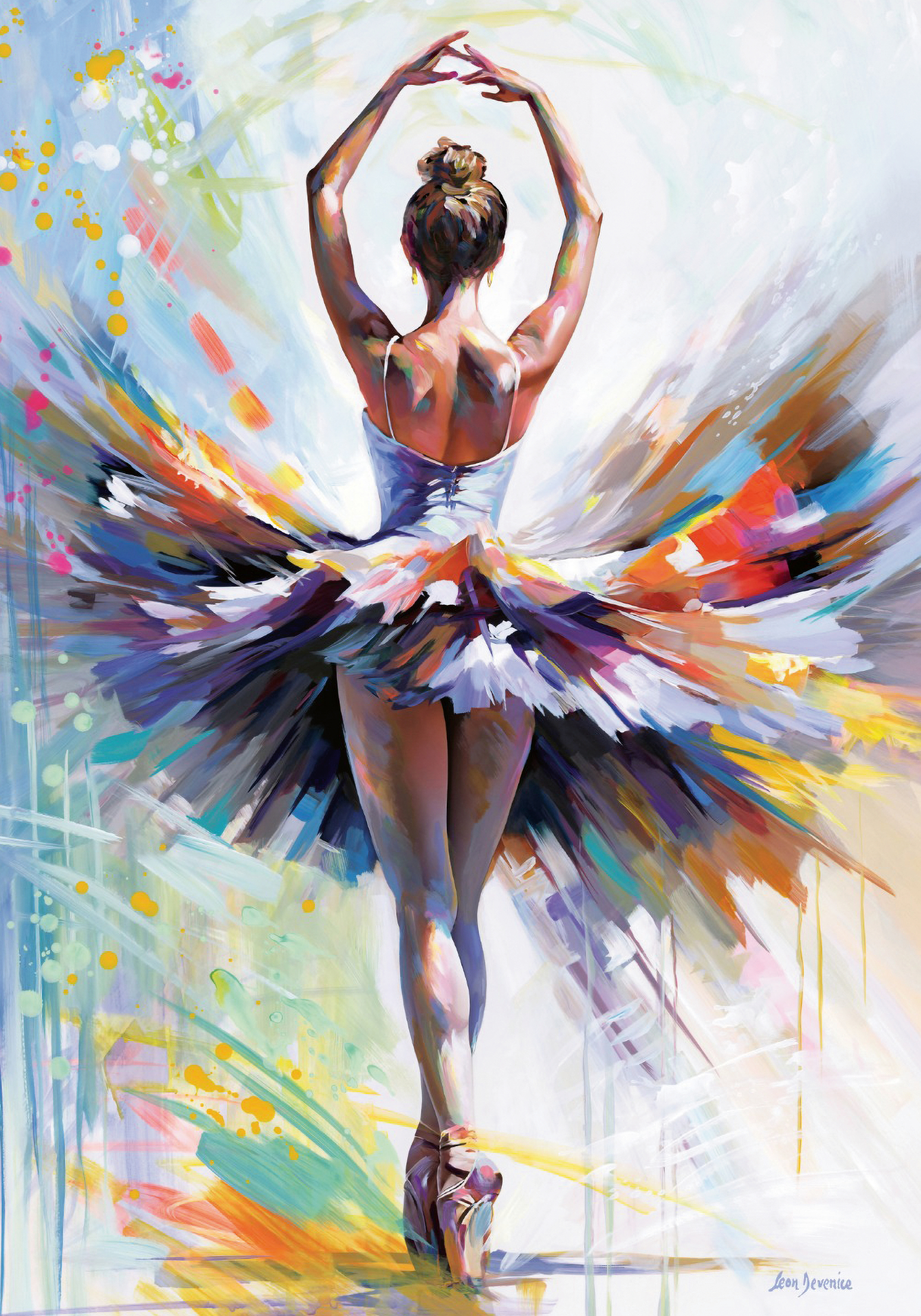 明るい色のチュチュを着たバレリーナが、つま先立ちで優雅にポーズをとっています。オレンジ、青、紫、黄色の鮮やかな色彩が躍動感を生み出し、エネルギッシュな雰囲気を醸し出すポスターです。