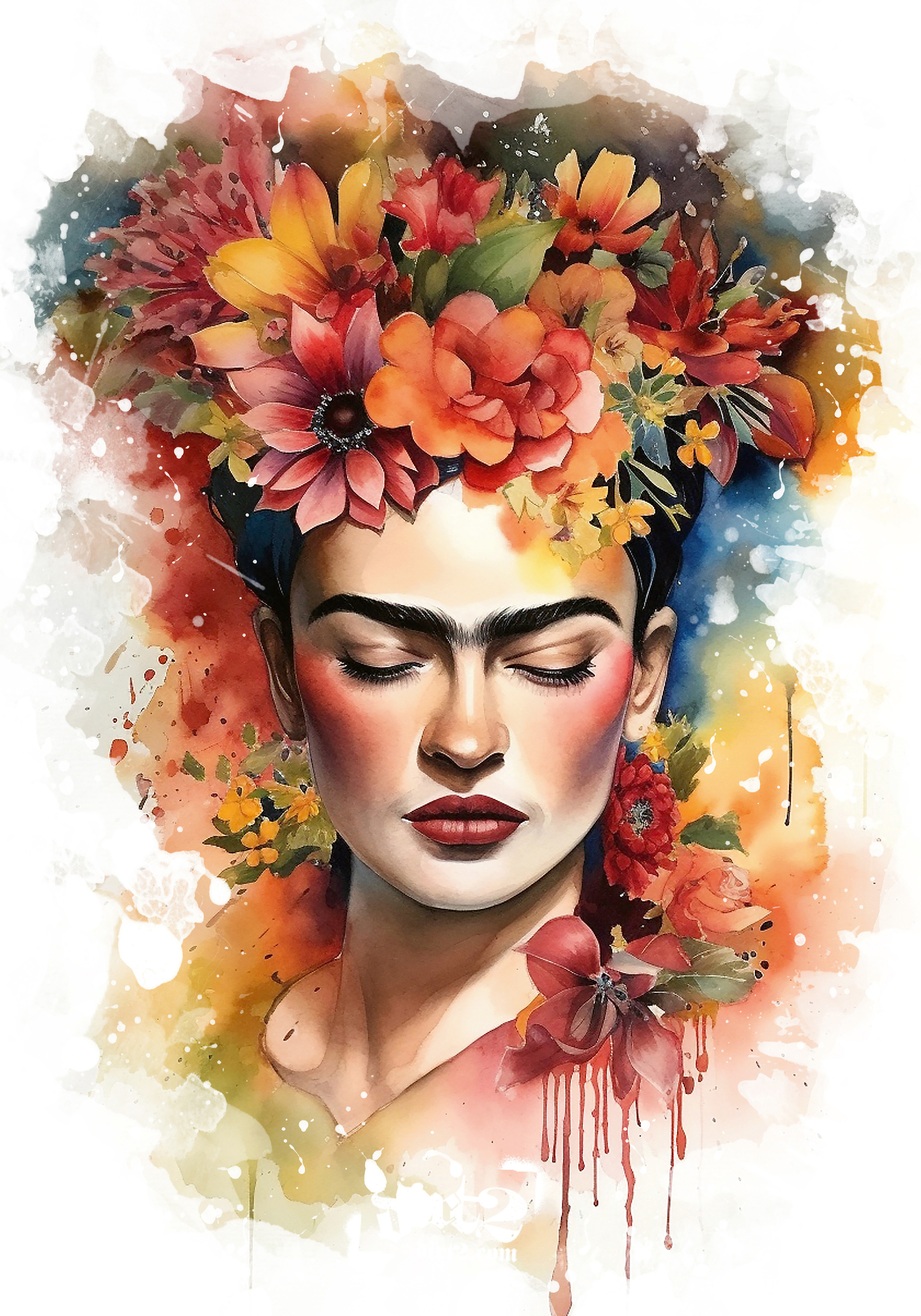 鮮やかな花に囲まれた女性の美しいポスターです。赤、オレンジ、黄色の花が髪を飾り、柔らかい水彩画のタッチで描かれています。カラフルで明るいアート作品です。