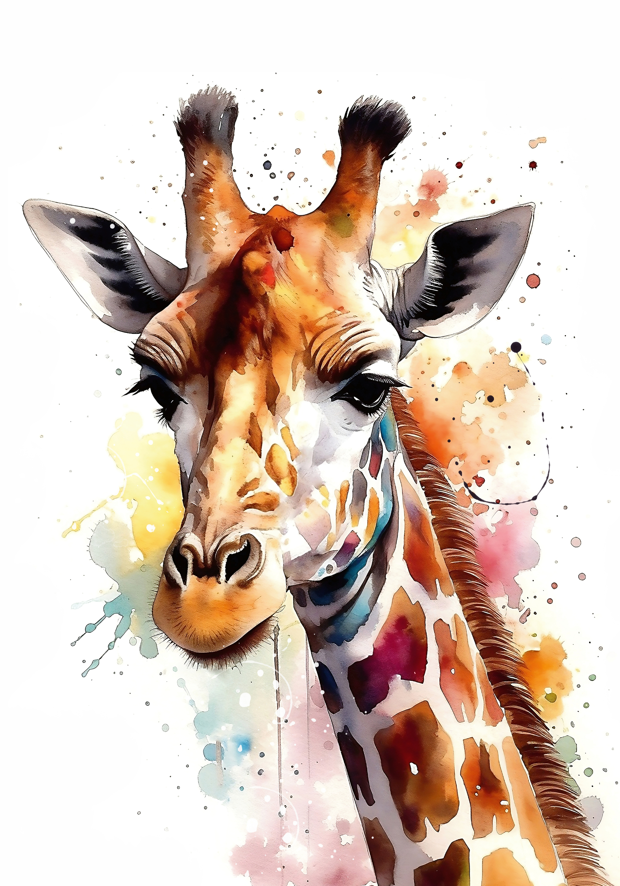 カラフルなキリンの水彩画ポスター。茶色、オレンジ、黄色、青、ピンクの鮮やかな色合いが特徴です。白い背景に絵の具が飛び散り、優しいタッチで描かれています。