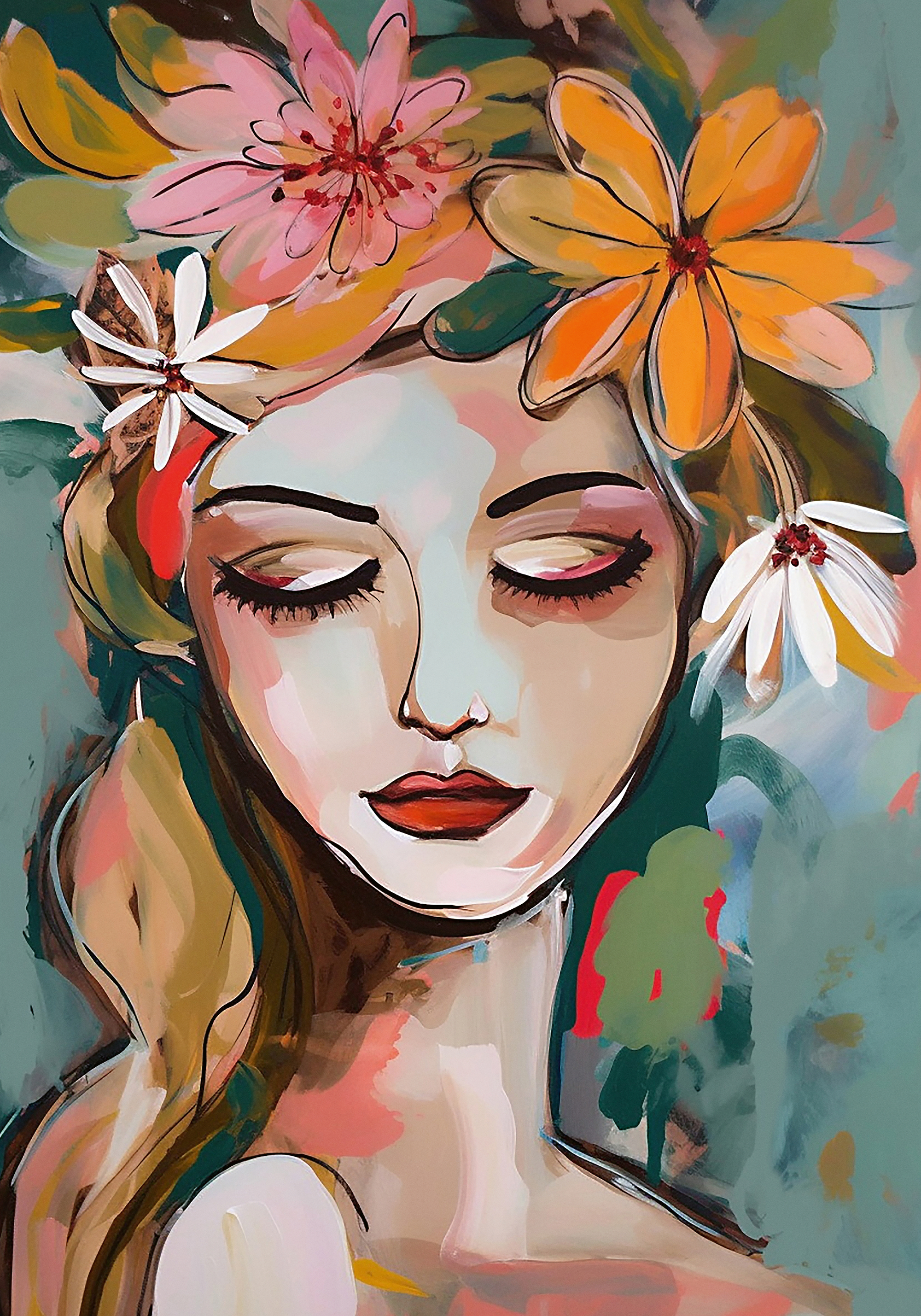 目を閉じた女の子の顔に、ピンクやオレンジの大きな花が飾られたポスターです。ティールとピーチ色の背景が美しく、抽象的でカラフルなアートスタイルです。
