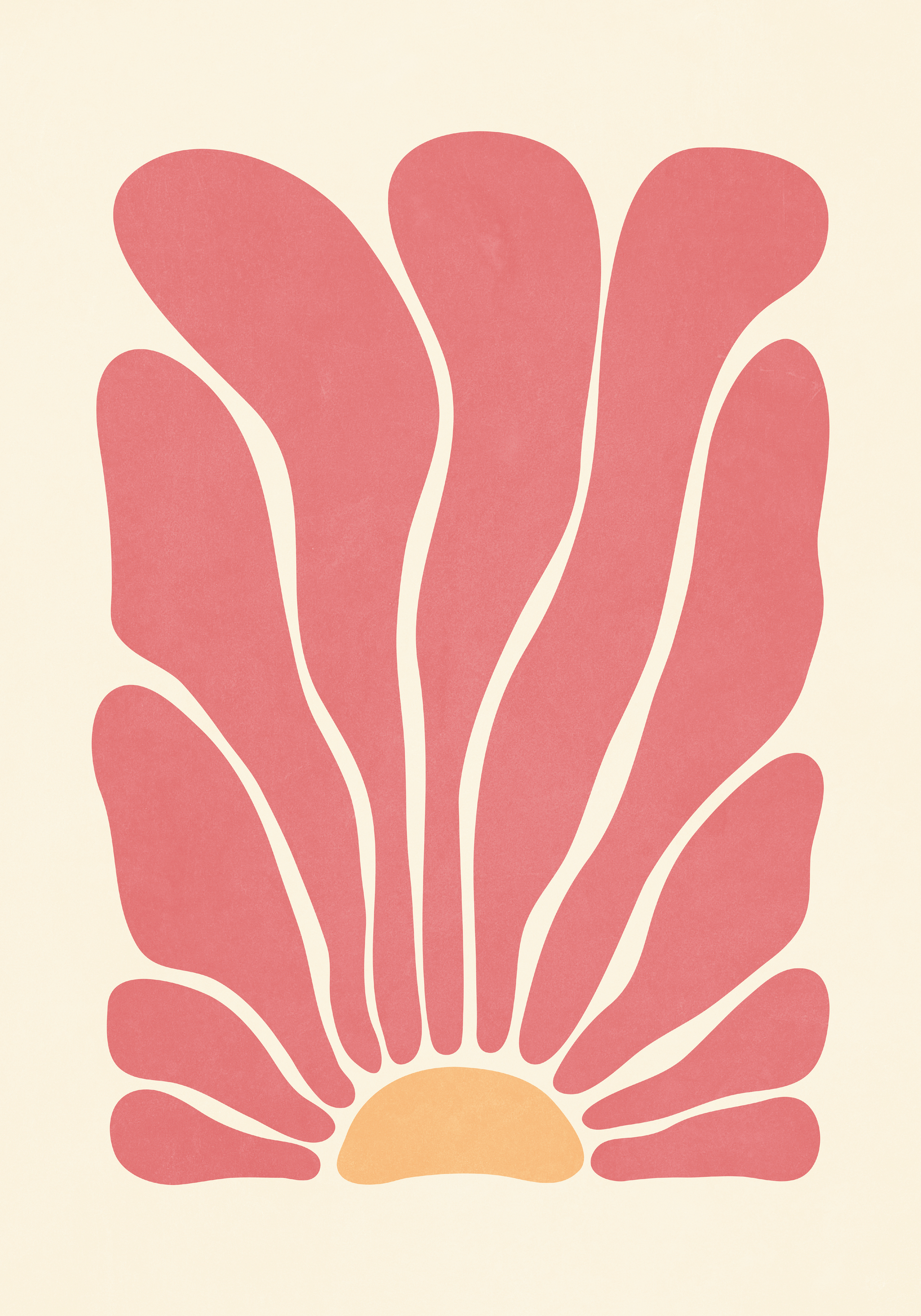 ピンクの花びらのような形が、クリーム色の背景に広がる抽象アートポスターです。中心の黄色とオレンジの半円から、やわらかな花びらが放射状に伸びています。シンプルで温かみのある色合いが、お部屋を明るく優しい雰囲気にしてくれます。