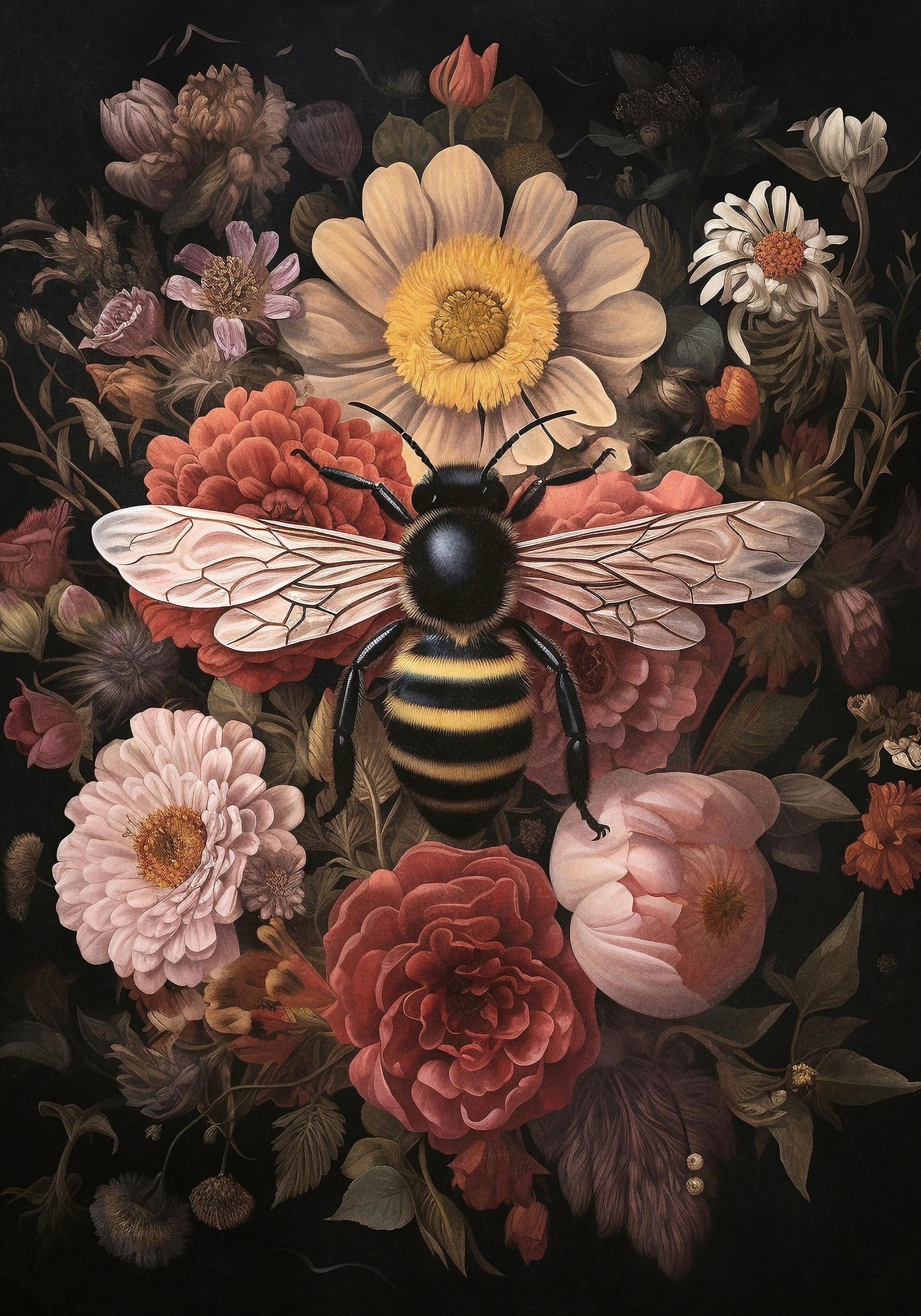 大きな黄色と黒のしま模様のハチが、ピンク、赤、白、オレンジの美しい花々に囲まれています。暗い背景が色鮮やかなハチと花を際立たせる、魅力的なヴィンテージポスターです。