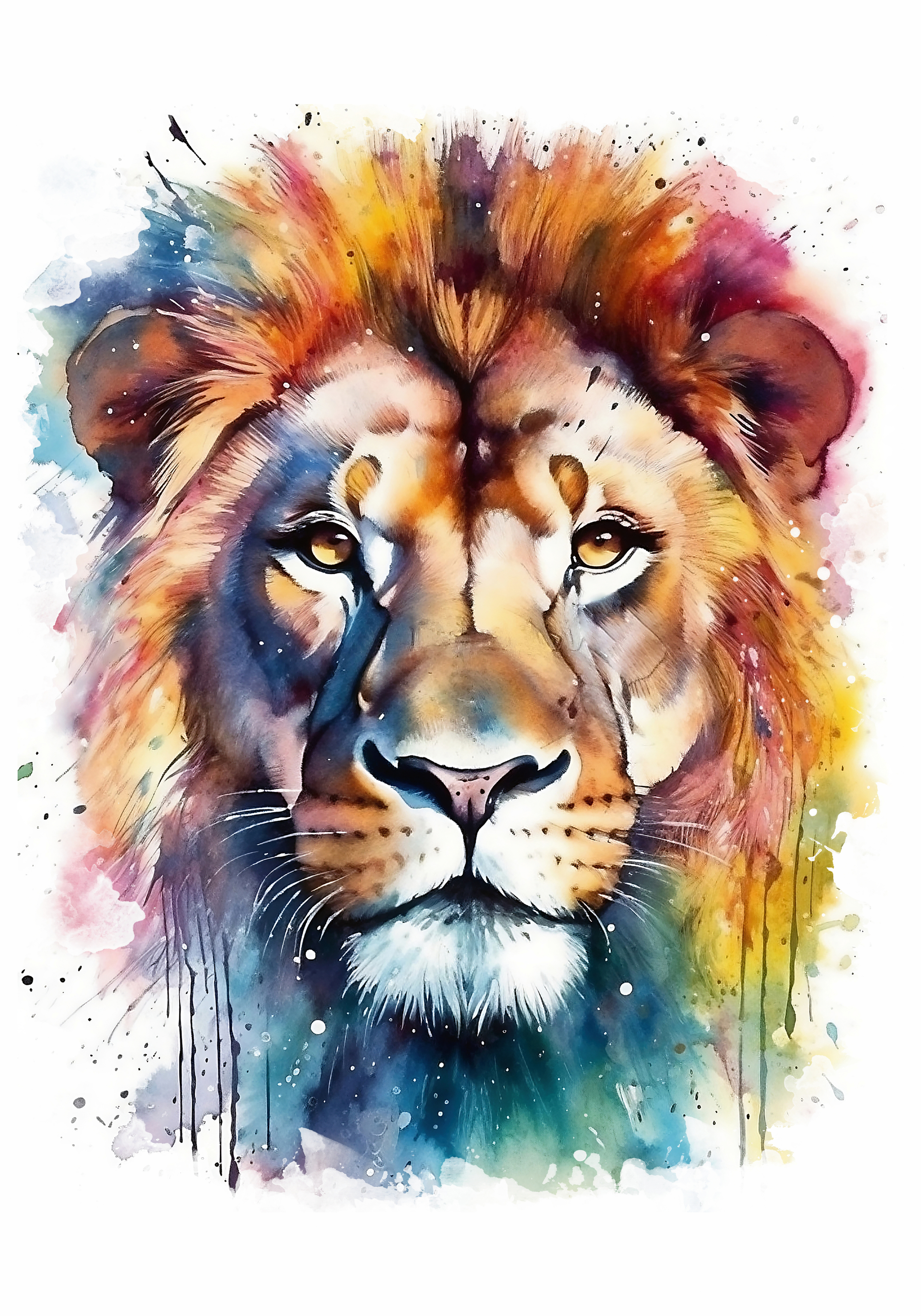 カラフルな水彩画で描かれたライオンの顔のポスター。オレンジ、赤、黄色、青のたてがみが美しく、明るい目が印象的です。絵の具が垂れて飛び散る様子がダイナミックで、柔らかく流れるような質感が特徴的なアート作品です。