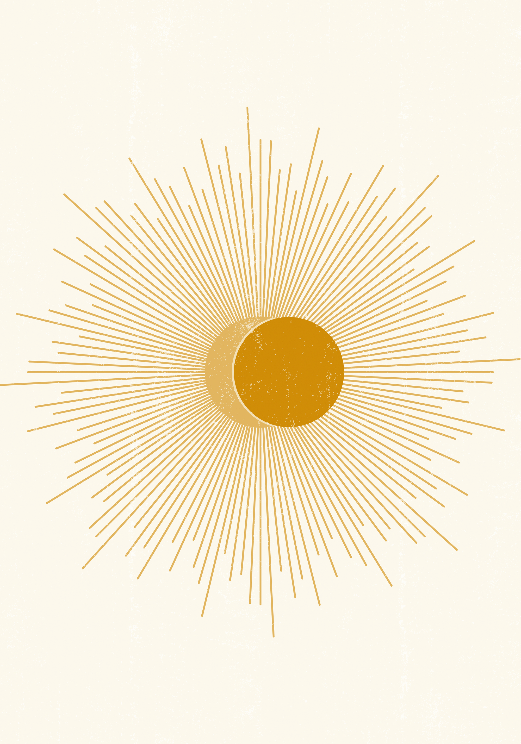 中央の黄金の円から細い線が放射状に広がる、美しいスターバースト模様のポスターです。ベージュの背景に浮かぶ、温かみのある太陽のようなデザインが、お部屋に優しい光を添えます。
