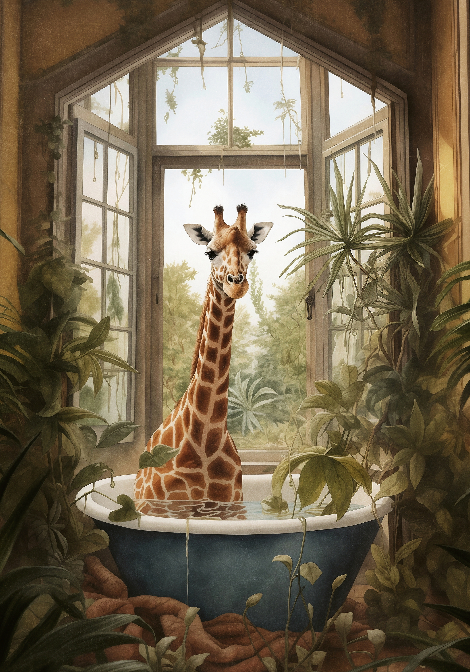 青いバスタブに立つキリンと、窓から差し込む光が作る穏やかな空間。緑の植物に囲まれた癒しのバスルームポスター。
