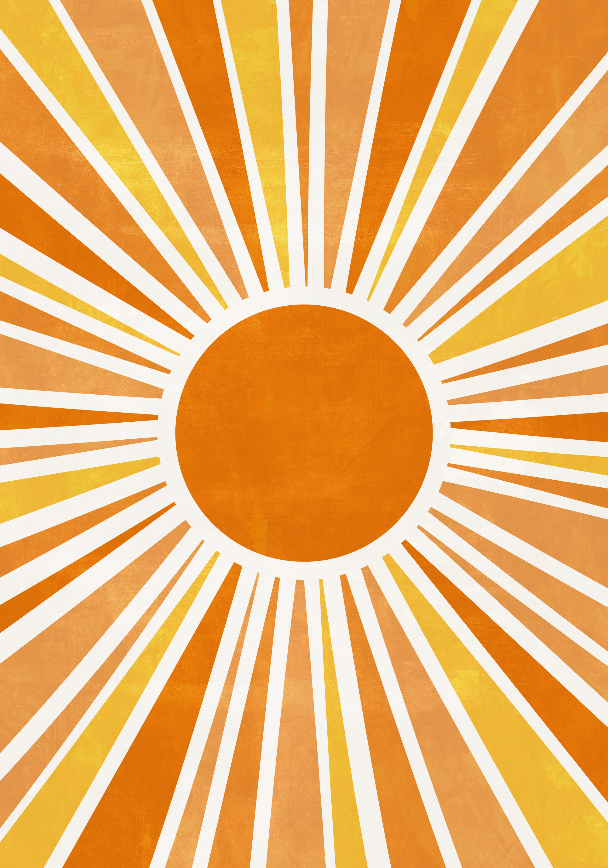 オレンジと白の光が広がるサンバーストデザイン。大きな円から放射状に伸びる明るい模様が、お部屋にレトロで元気な雰囲気を作ります。温かみのあるオレンジと黄色の色合いが特徴的なポスターです。