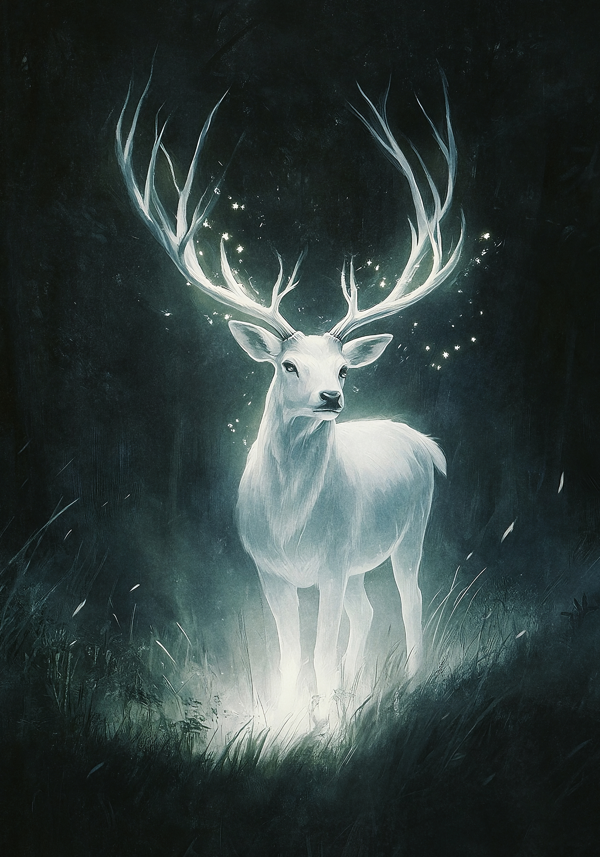 暗い森の中で、大きな角を持つ白い鹿が立っています。角の周りには小さな光が輝き、魔法のような雰囲気を作り出しています。