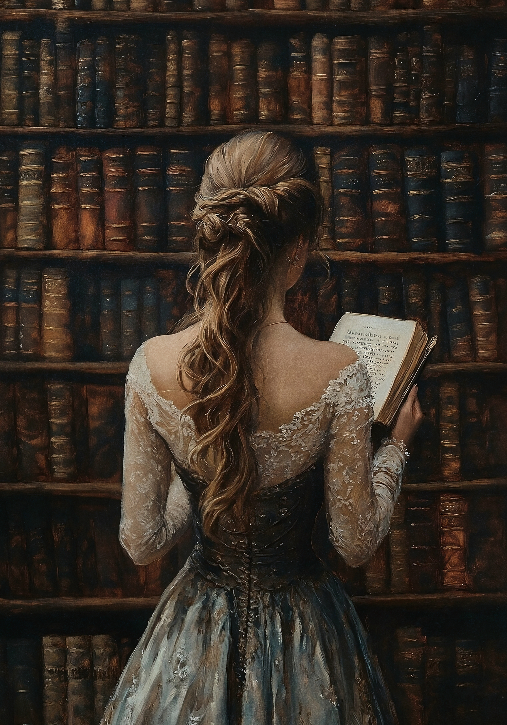 本を持つ女性と古い図書館の美しいポスター。レースのドレスと茶色の本棚が温かい雰囲気を作ります。