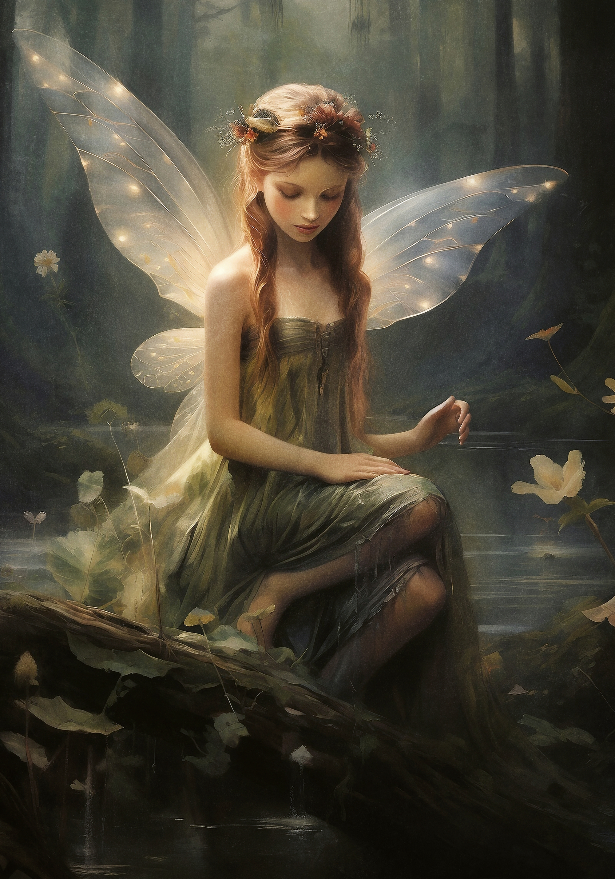 静かな森の池のほとりで、妖精が丸太の上に座っています。透き通るような羽と花の冠が美しく、緑色のドレスが輝いています。白い花と葉に囲まれた、魔法のような世界を感じるポスターです。