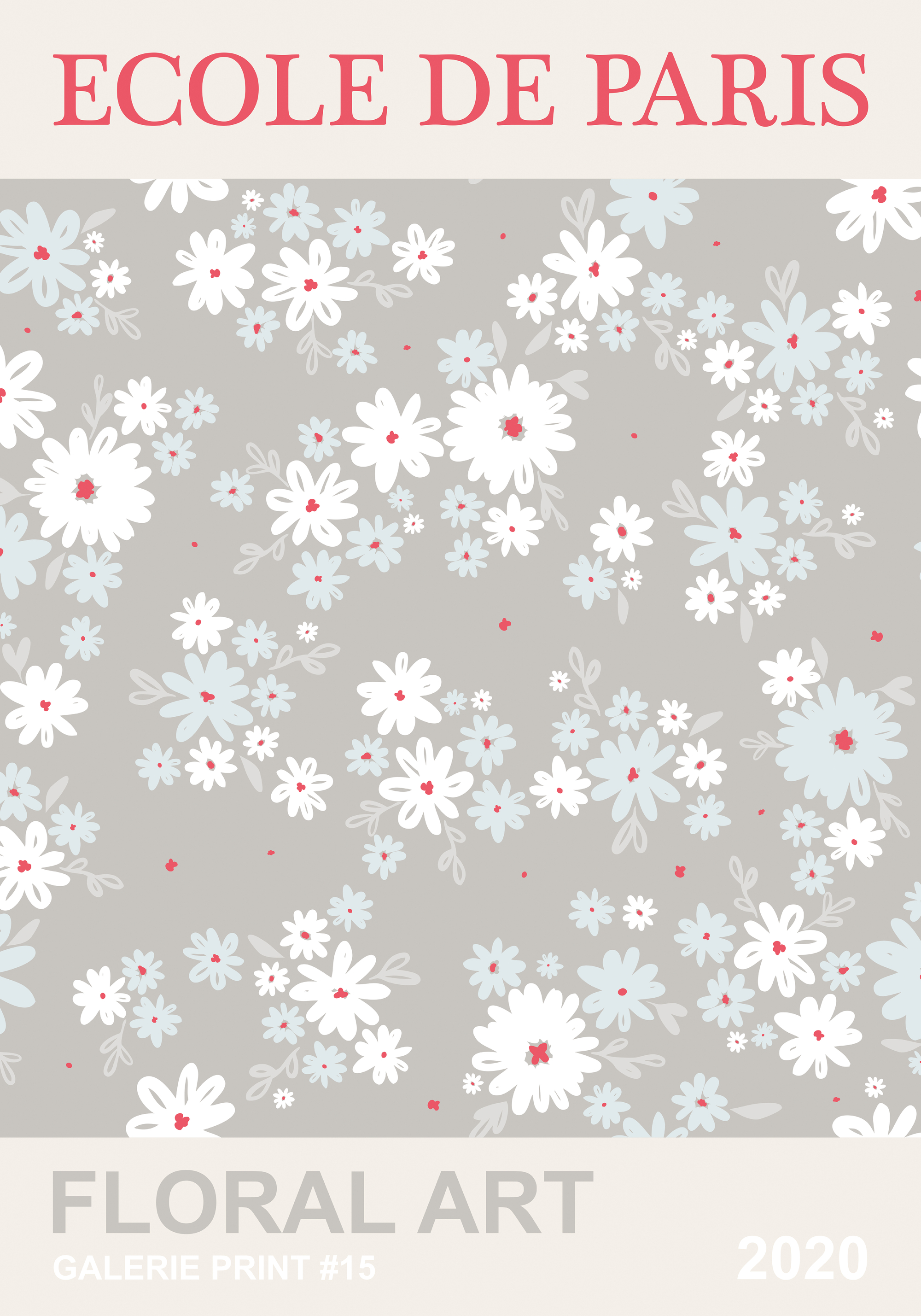 白と水色の花がグレーの背景に優しく咲くフローラルアートポスター。赤い文字で「ECOLE DE PARIS」と書かれた柔らかくて繊細なデザインです。