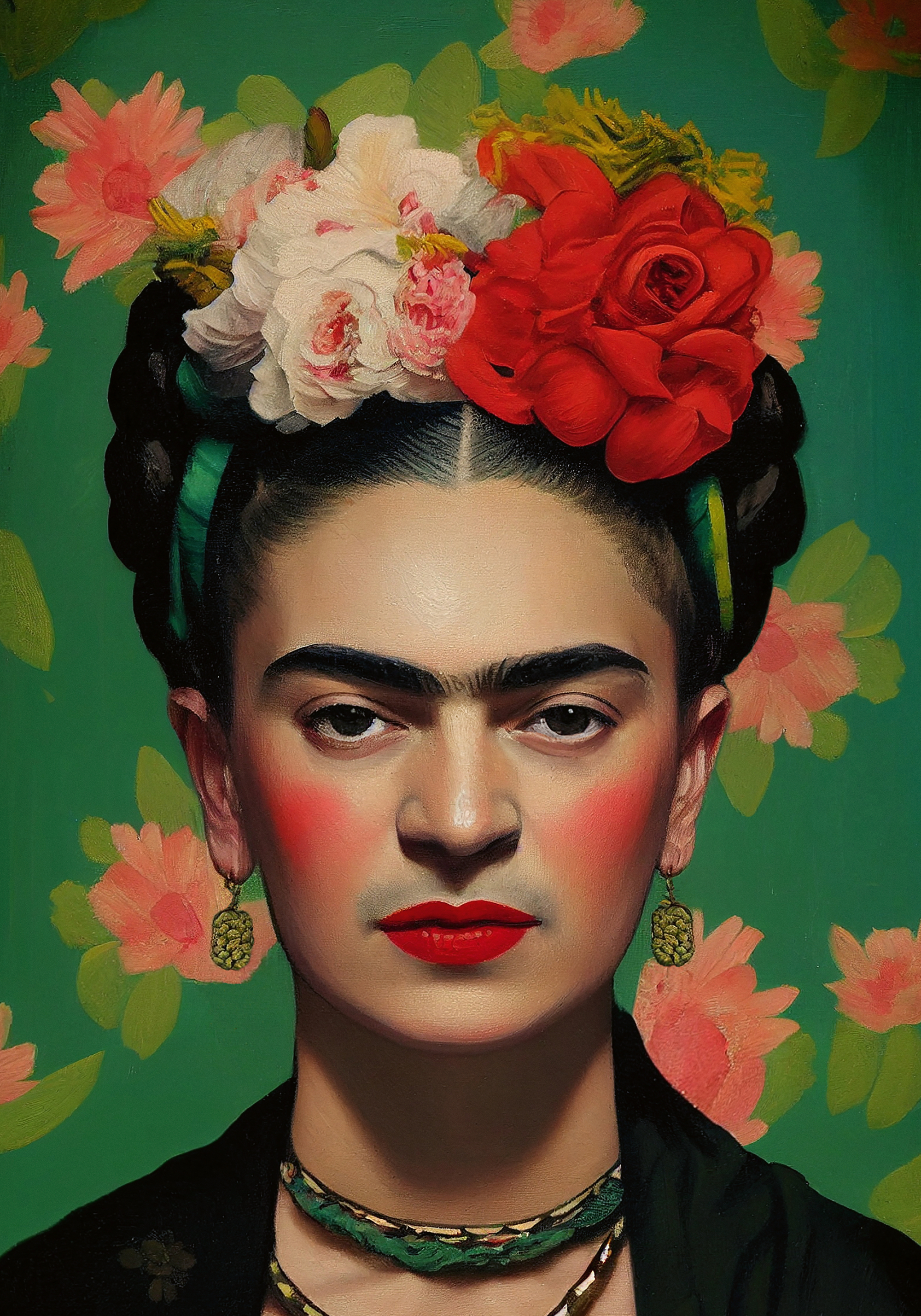 鮮やかな赤と白の花で飾られた黒い編み込みの髪、大胆な眉毛、赤い唇が特徴的なポスター。緑の背景にピンクの花が咲き、ゴールドのイヤリングが輝きます。