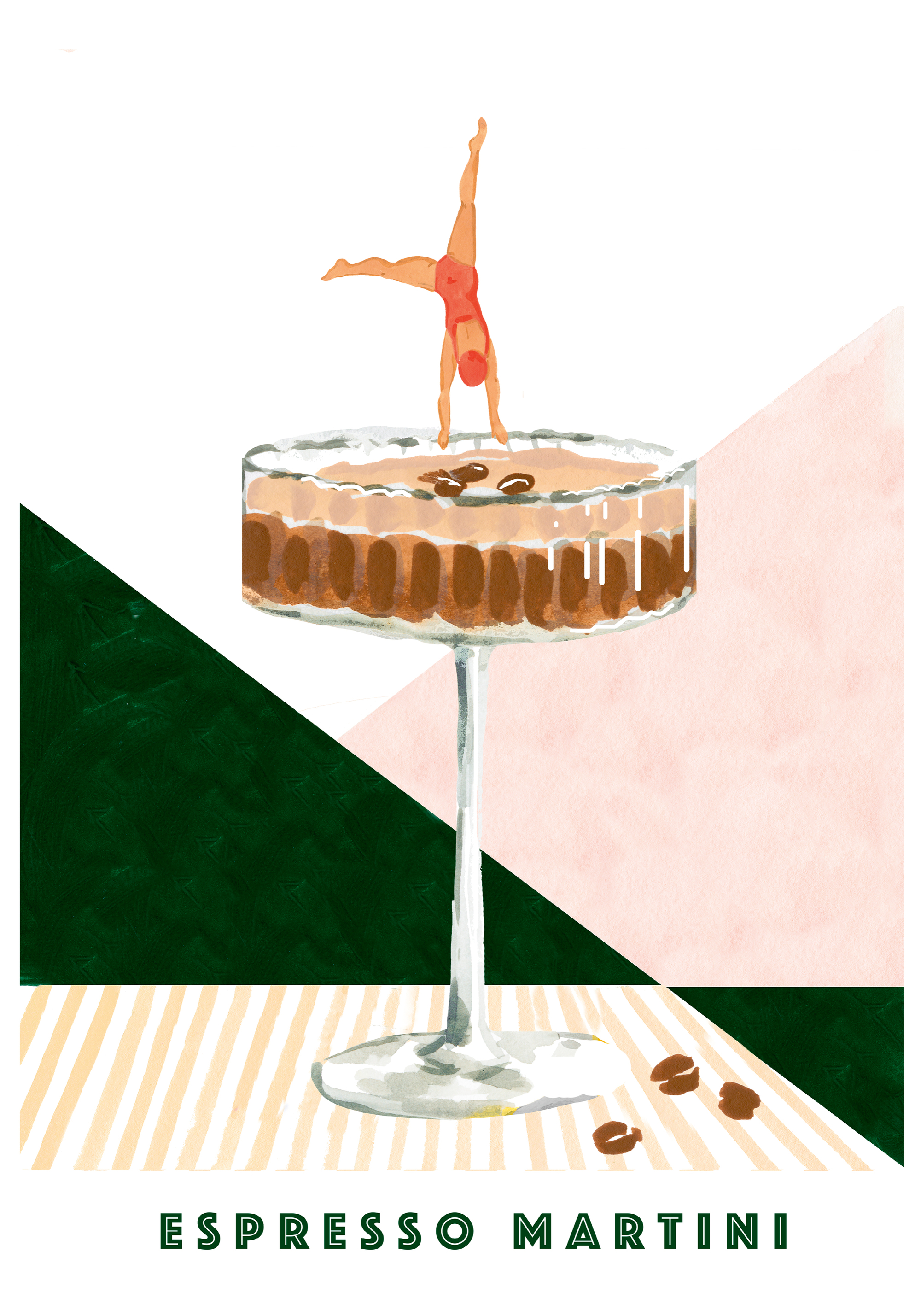 背の高いグラスに入った茶色のドリンクのポスターです。グラスの縁で逆立ちをする小さな赤い服の人が描かれています。コーヒー豆が浮かび、カラフルな三角形と黄色のストライプが背景を彩ります。エスプレッソマティーニのユニークなアート作品です。