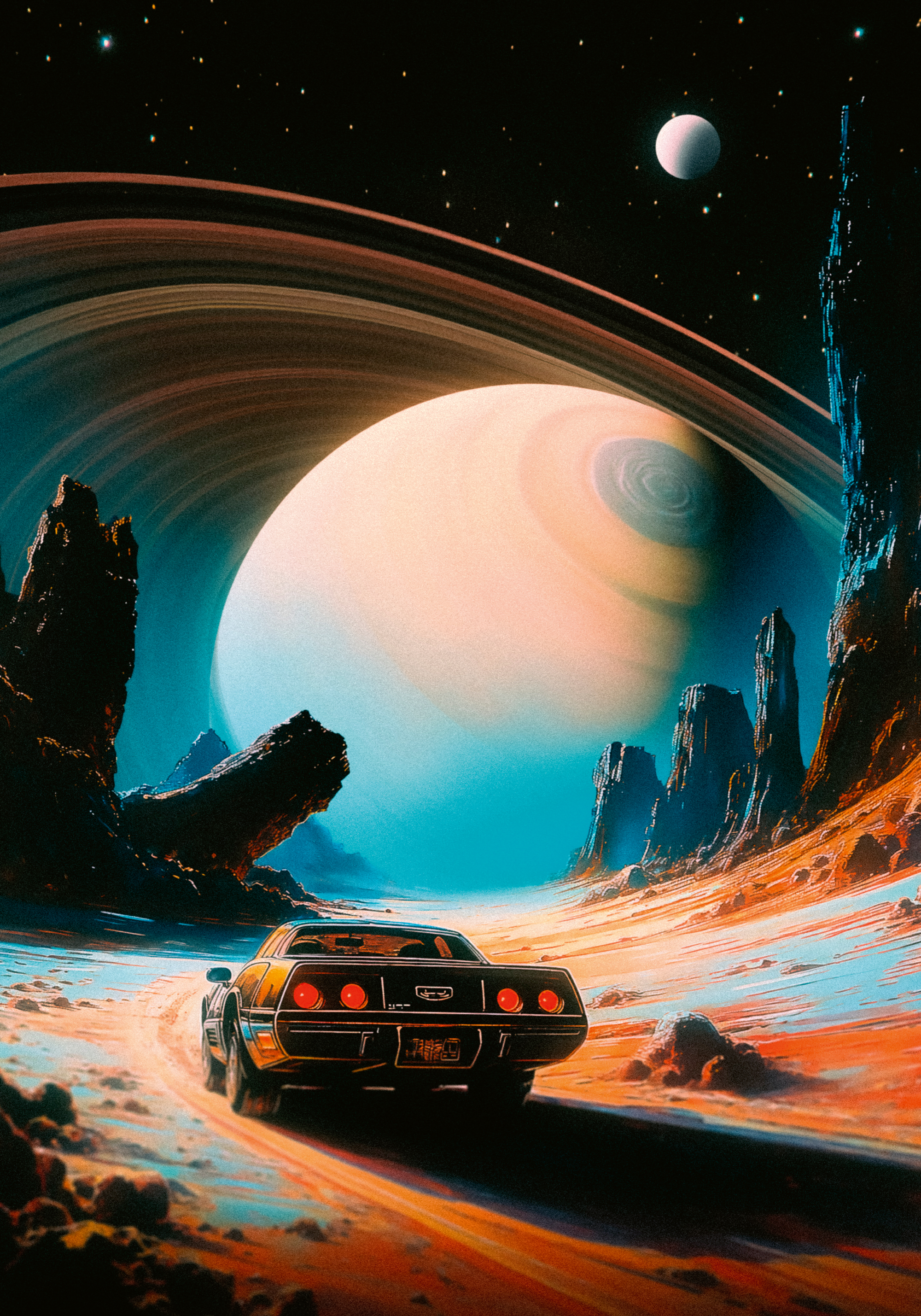 岩だらけの惑星の風景を走る車のポスター。大きな惑星と輪が空に浮かび、オレンジと青の地面には高い岩が立っています。カラフルで未来的なアート作品です。