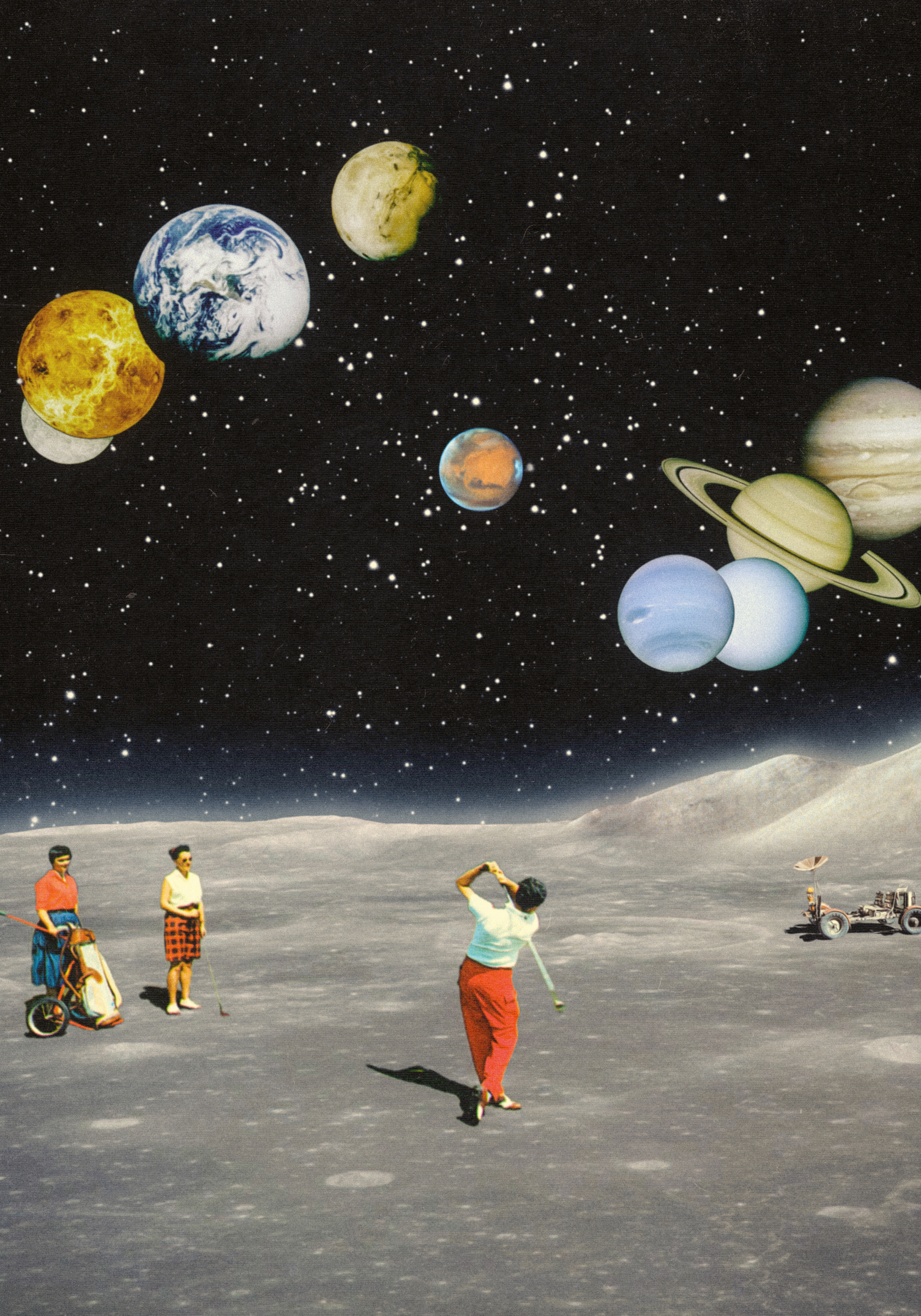 月のような灰色の地面でゴルフをする人々のポスター。夜空には地球や土星など、大きくてカラフルな惑星が浮かんでいます。不思議な宇宙の世界を楽しめるアートです。
