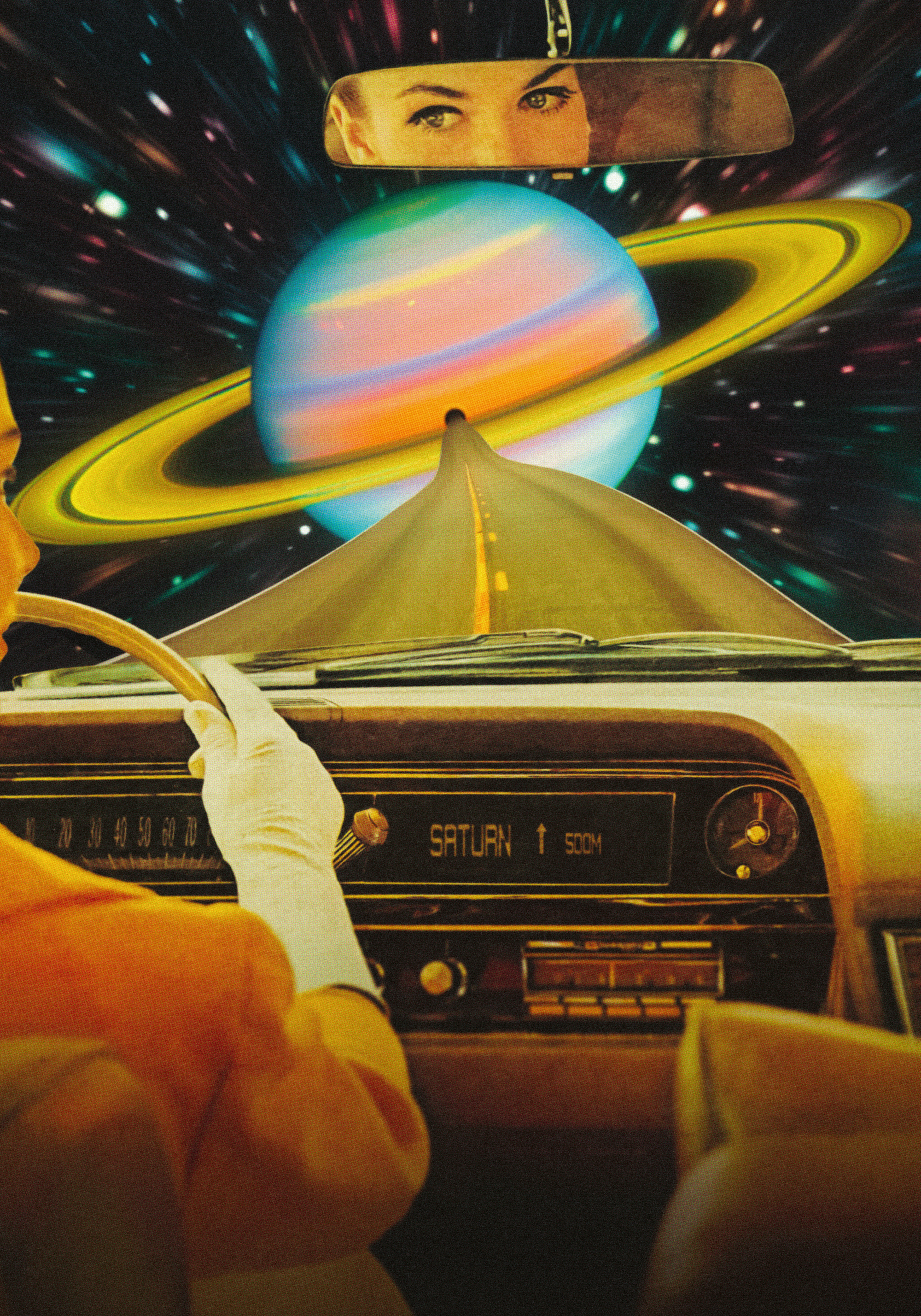 車の中から見える大きな土星。星空の中をドライブする不思議な絵です。ダッシュボードには「SATURN 500M」の文字。バックミラーに映る目が印象的。宇宙とレトロな車が混ざった面白いポスターです。