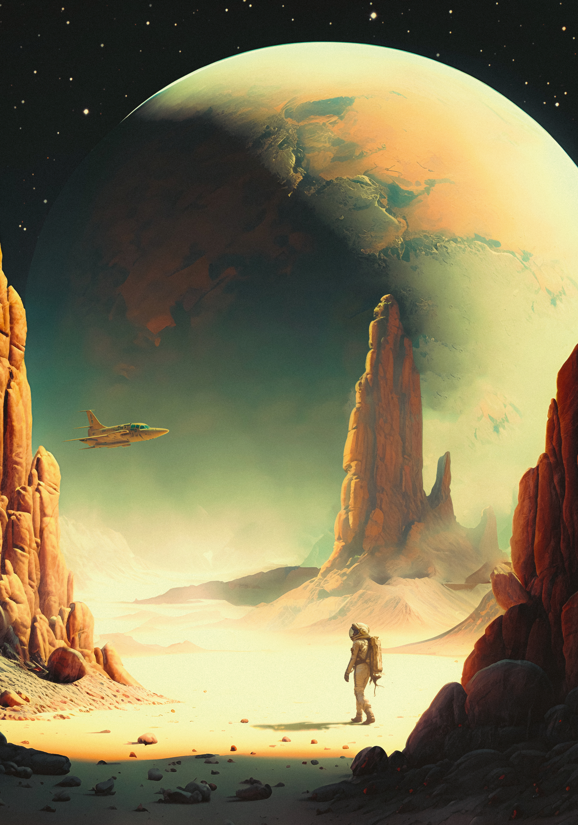 大きな惑星が空を彩る宇宙ポスター。砂漠の岩山と宇宙飛行士が冒険の世界へ誘います。お部屋に星空の魔法を飾りましょう。