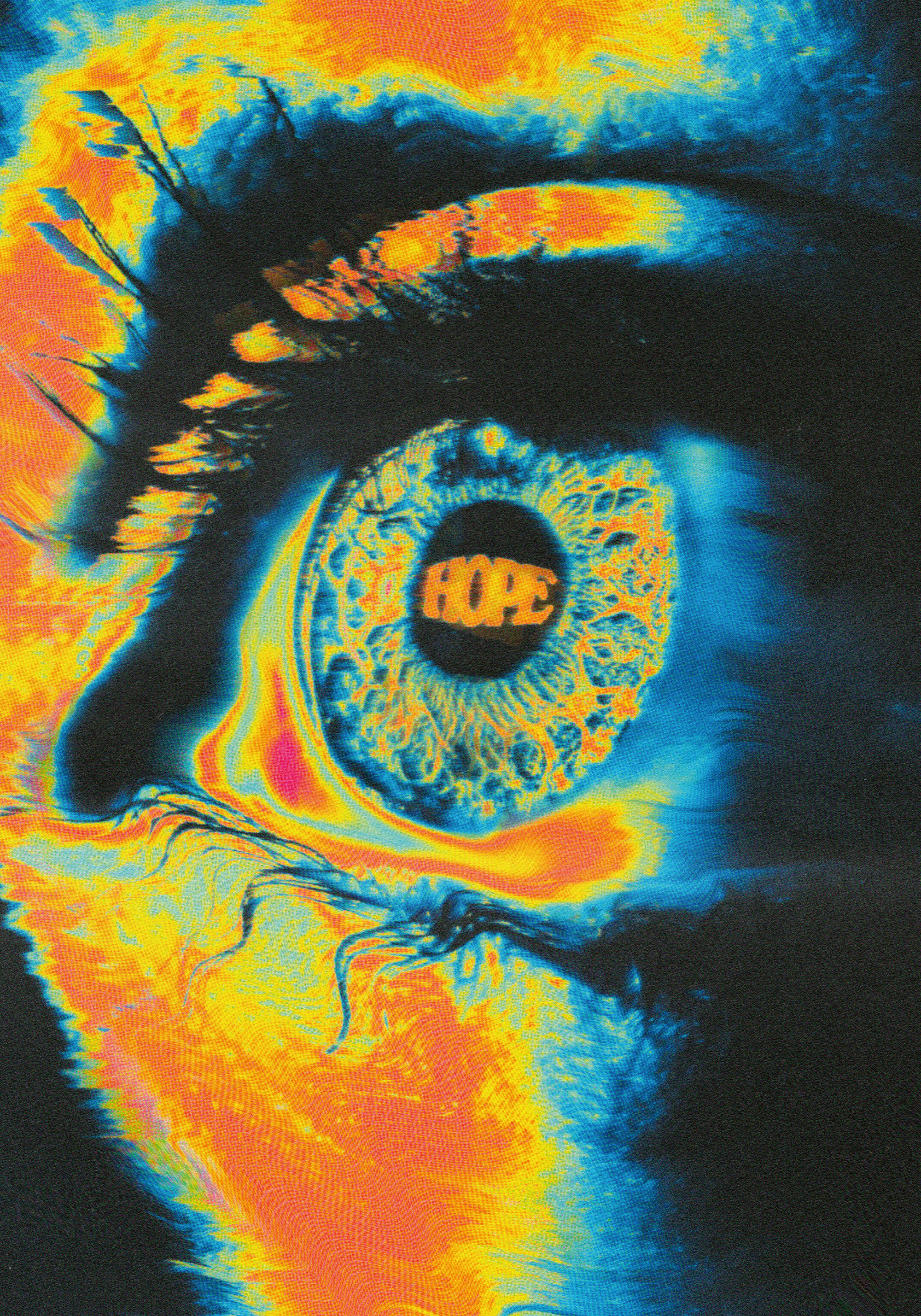 カラフルな目のポスター。青い瞳に「HOPE」の文字が入っています。青、黄色、オレンジの色が印象的なアートです。