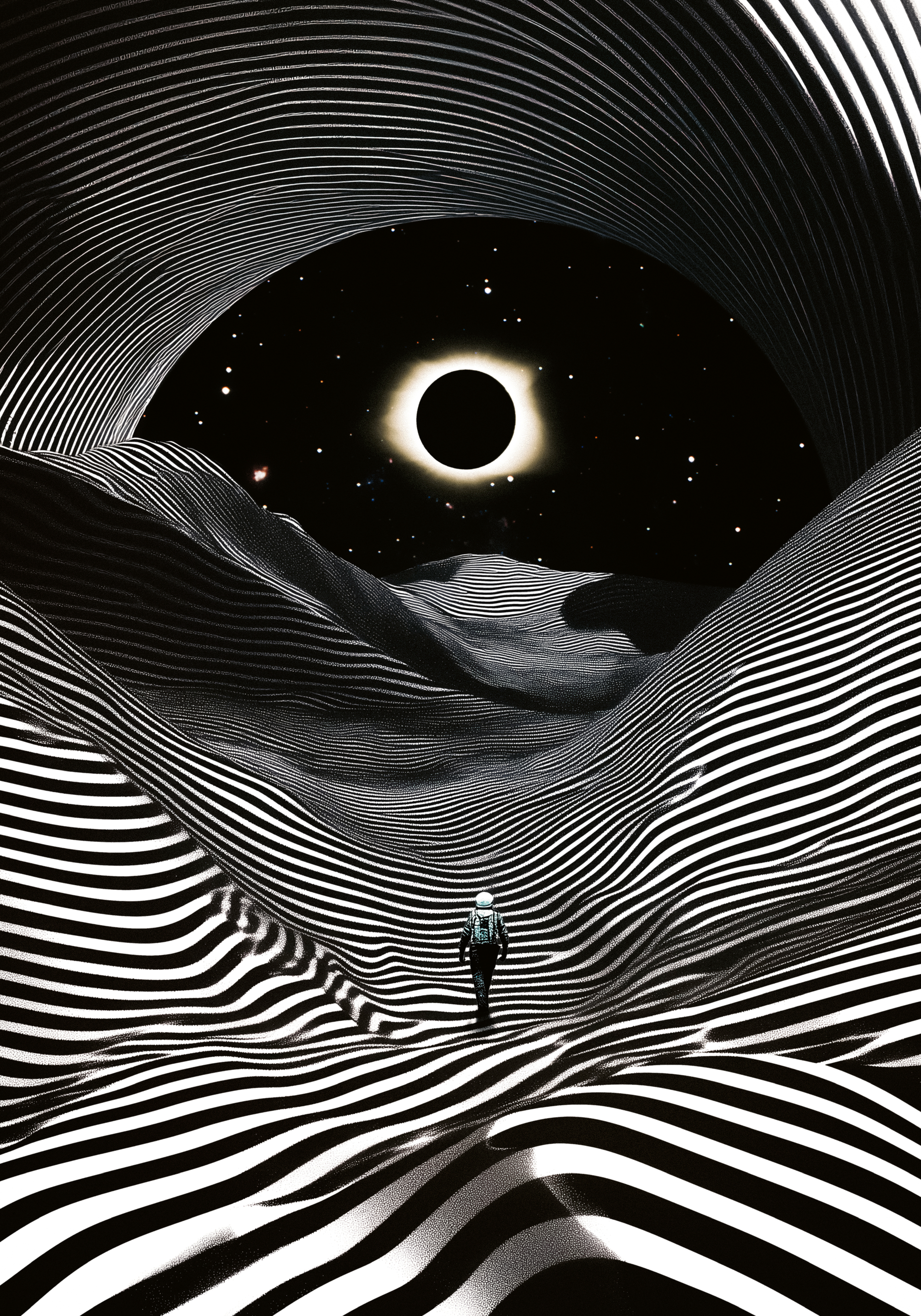 宇宙服を着た人が白と黒のしま模様の丘を歩くポスターです。空には星と日食が輝いています。