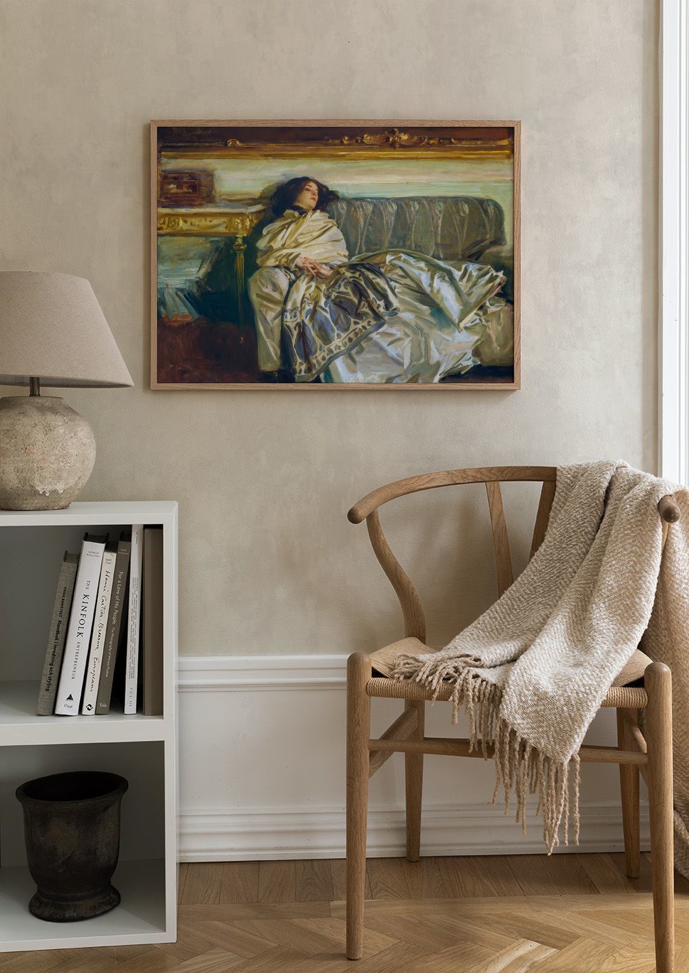 柔らかい布に包まれた人物が、青灰色のソファでリラックスしている絵のポスターです。暖かい色と冷たい色が混ざり合い、穏やかで優しい雰囲気を作り出しています。