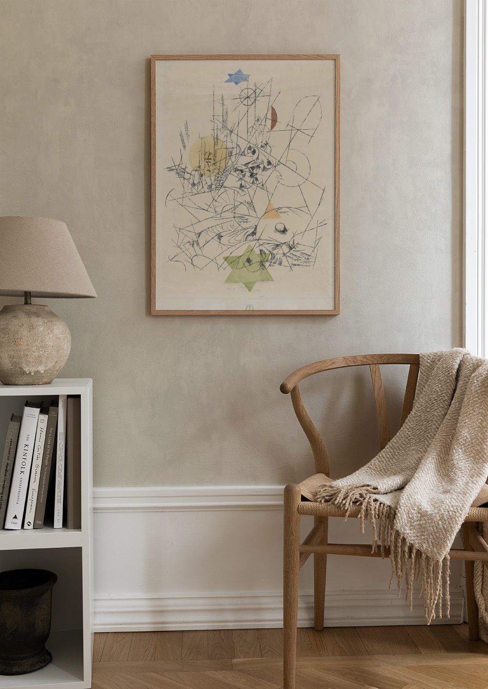 パウル・クレーの抽象アートポスター。細い黒い線が交差し、黄色、赤、青、緑、オレンジの円や星、三角形が描かれています。ベージュの背景に人の形も見えます。カラフルで楽しいデザインです。
