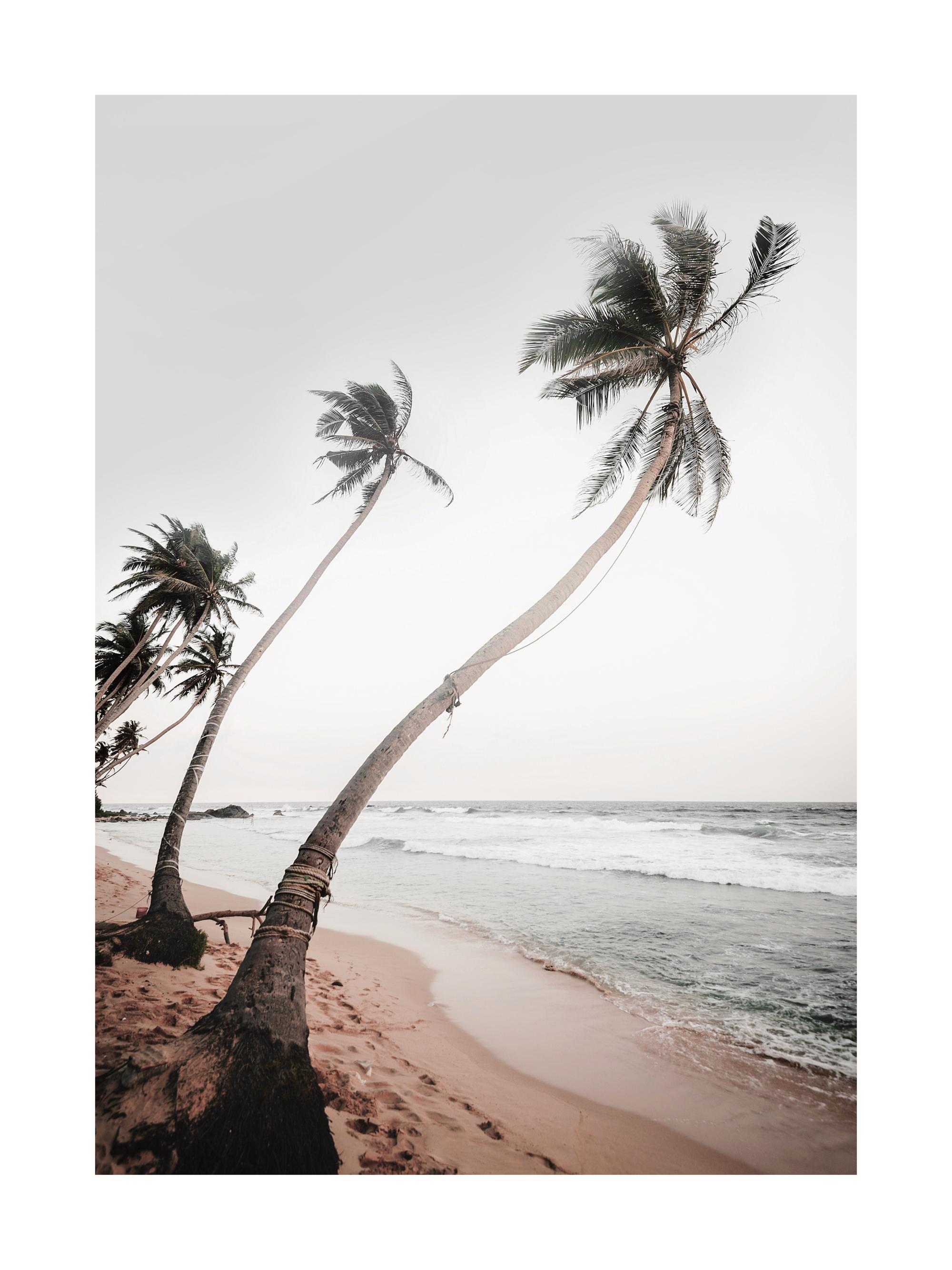 スリランカで撮影された美しいビーチとヤシの木のポスター。優しい穏やかなトーンでデザインされたポスターは他のベージュ系のポスターと合わせるとおしゃれれにまとめられます。このポスターは、デザインを際立たせるために、白い枠(ポスターの一部としての白い部分)がサイズ(寸法)に含まれています。