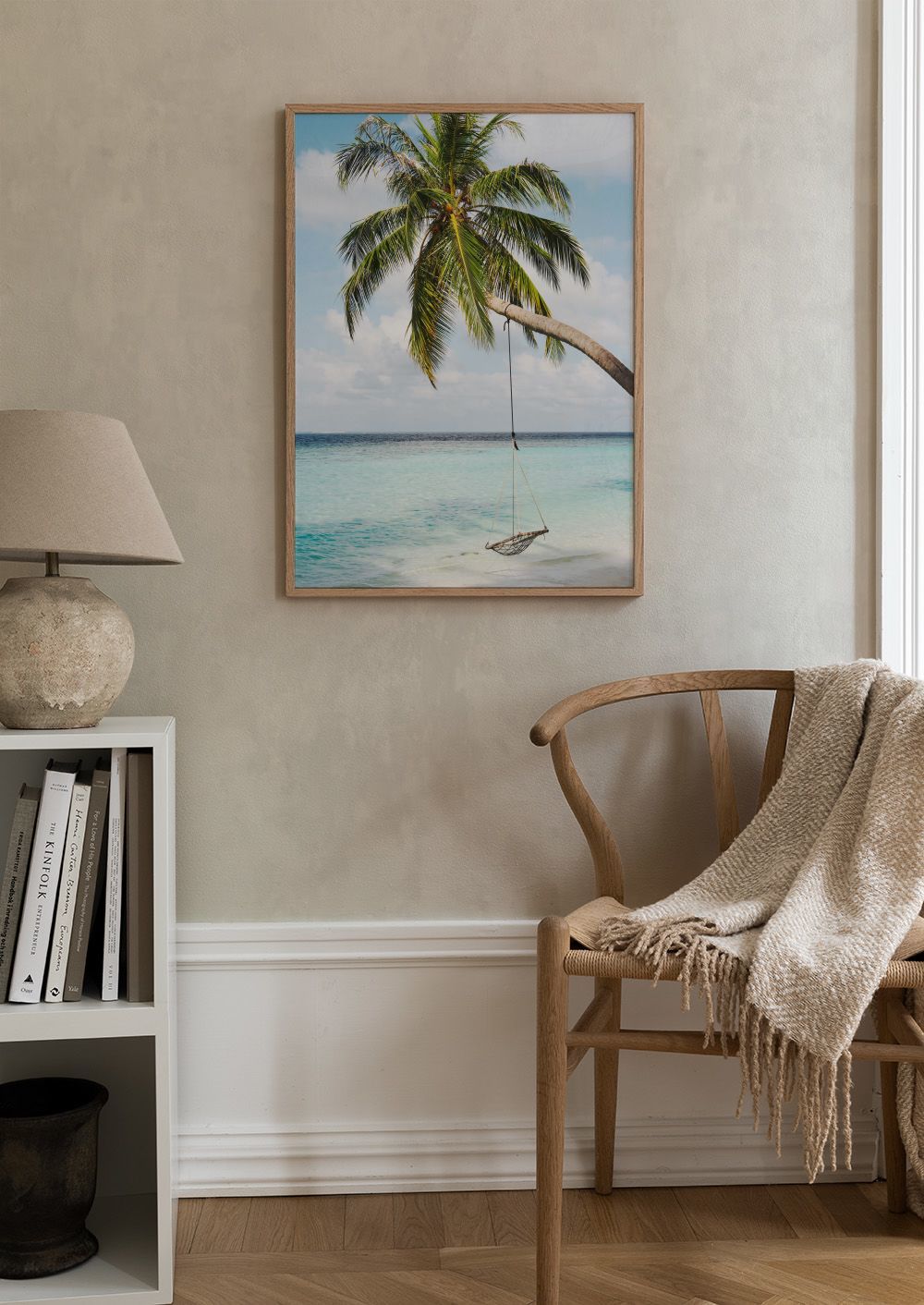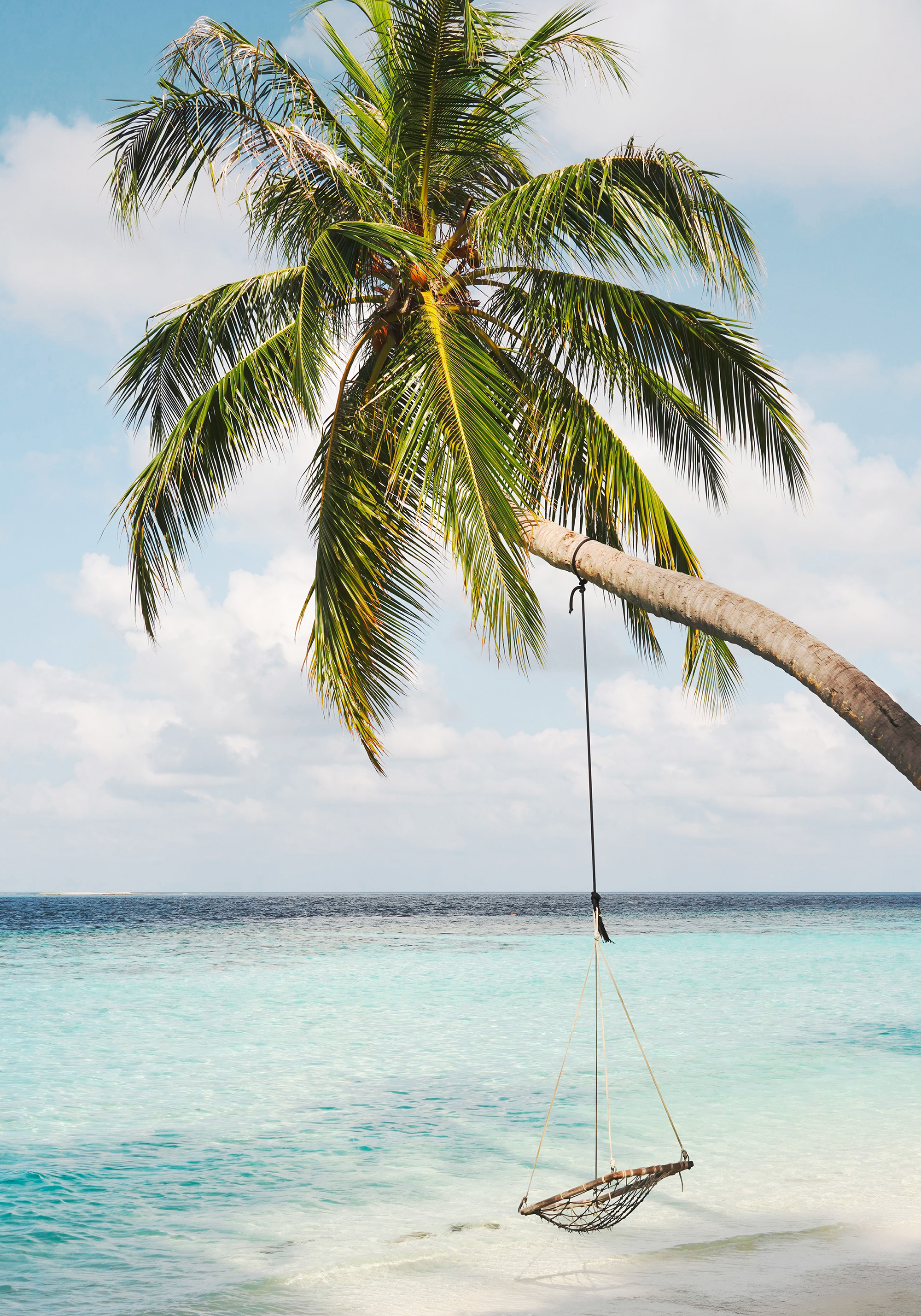 青い海の上に伸びるヤシの木と、そこから吊るされたロープのブランコが描かれた南国の楽園のようなポスターです。白い砂浜とターコイズブルーの海が、リラックスした雰囲気を演出します。