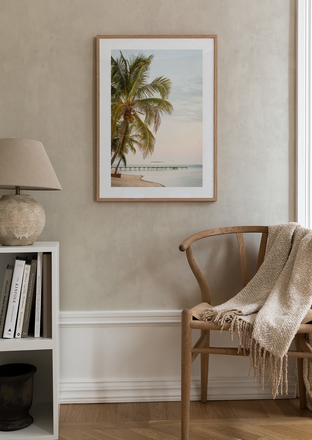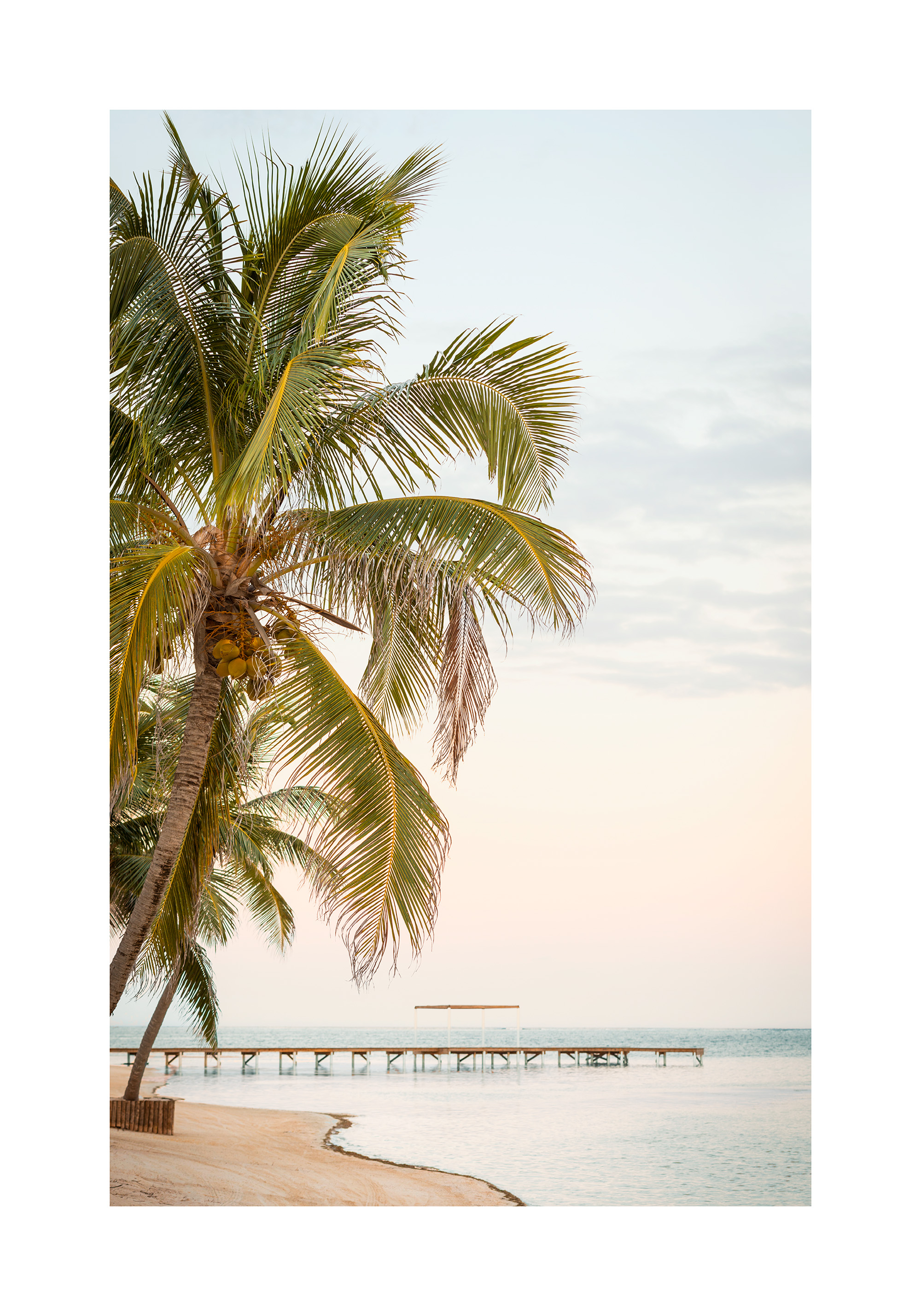 静かなビーチに立つヤシの木と海に伸びる桟橋。空はピンクと青が混ざり、穏やかな波が岸に寄せる南国の風景のポスターです。