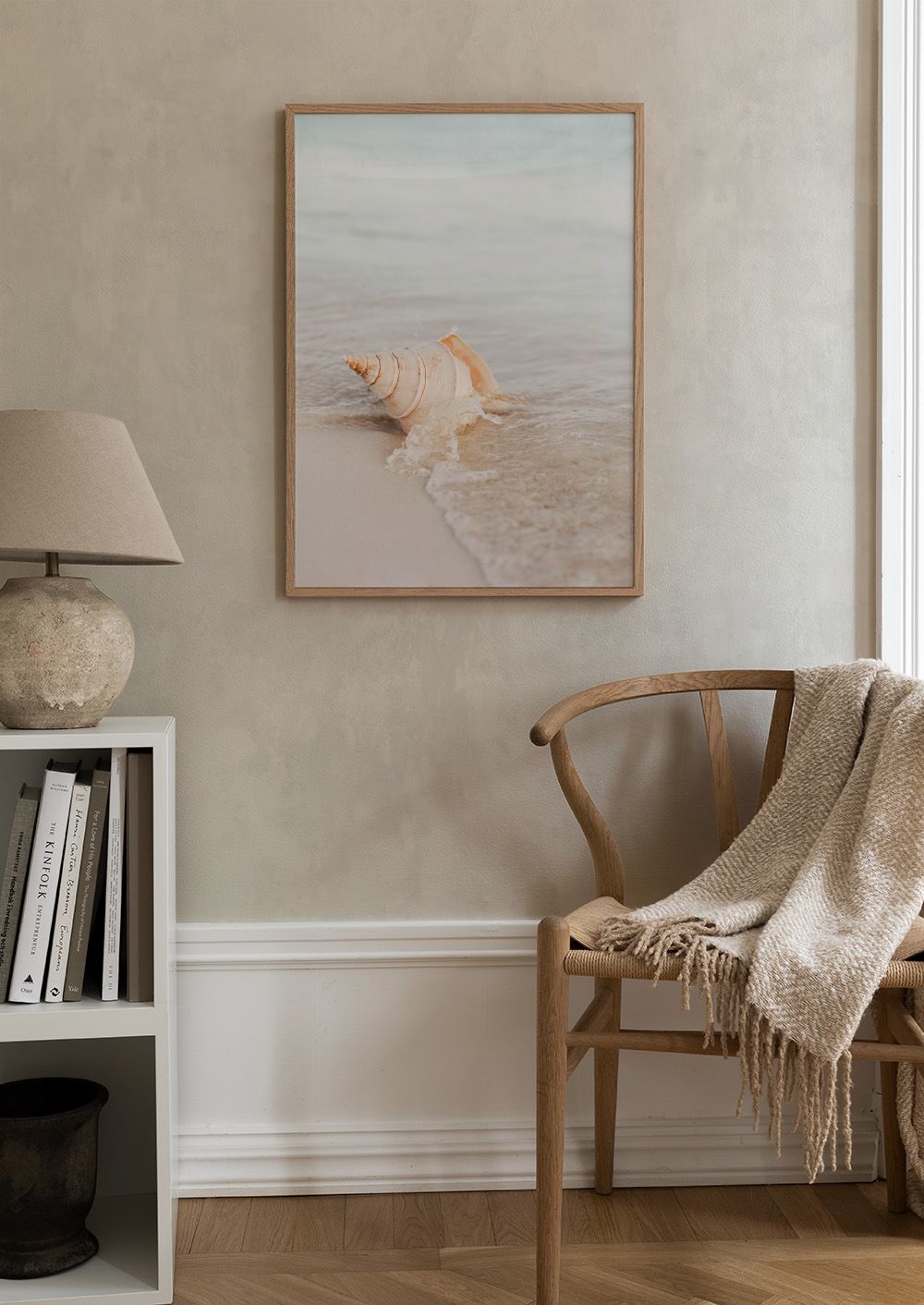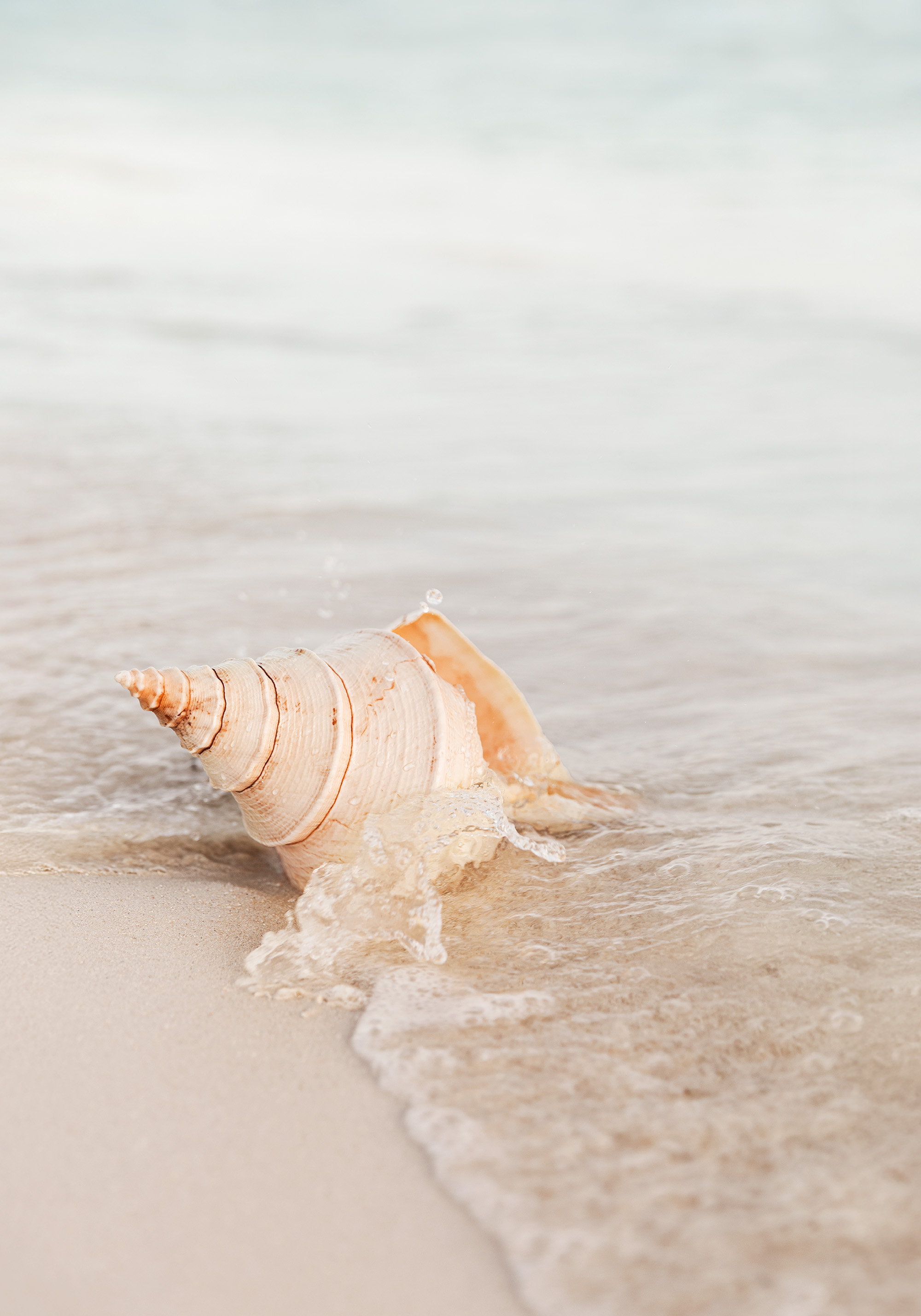 穏やかな波が優しく貝殻を包む、静かな海辺の風景。クリーム色の美しい巻貝が濡れた砂浜に横たわり、透明な水が作る柔らかな泡が印象的です。青と白が溶け合う背景が、心安らぐ海の雰囲気を演出します。