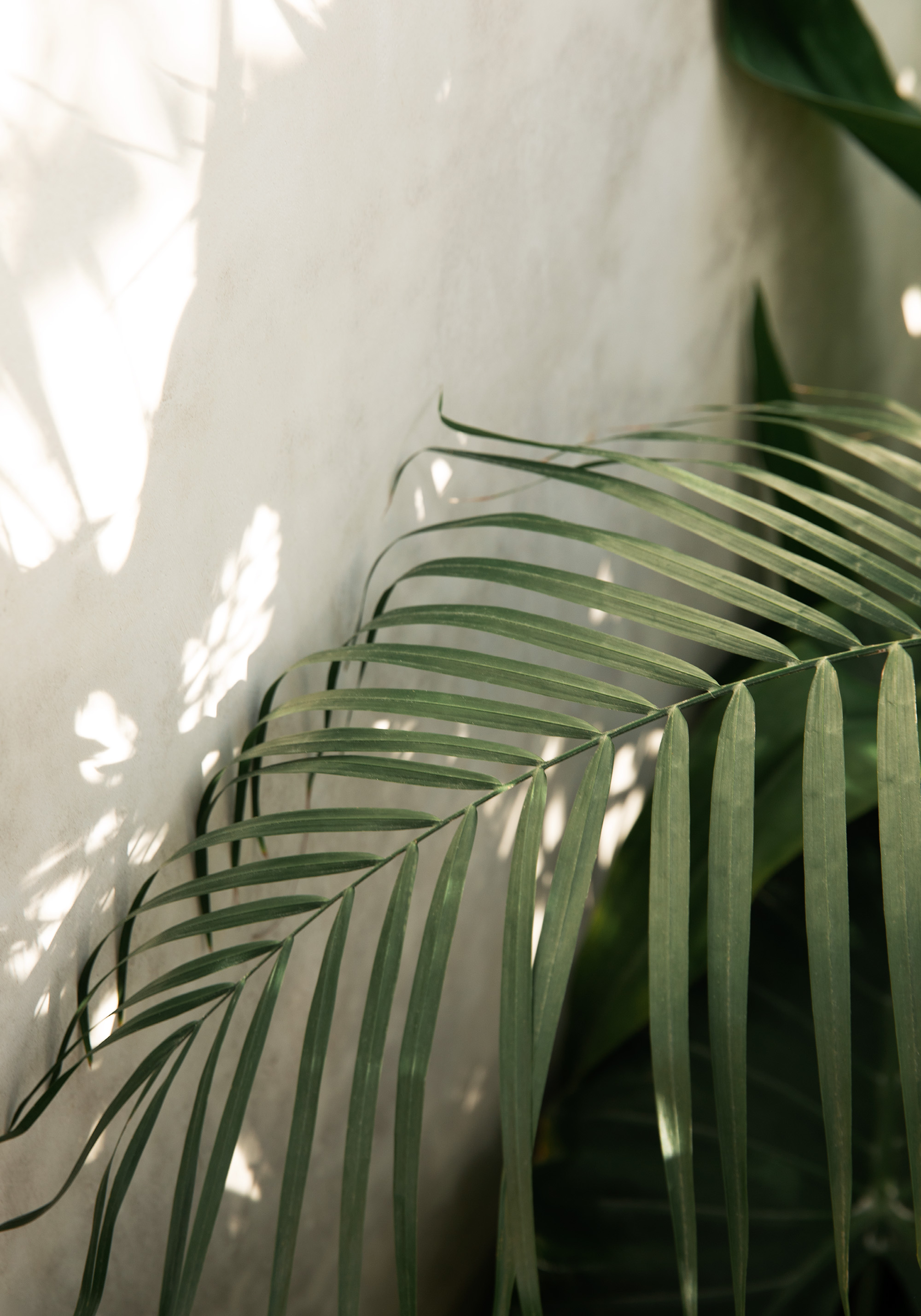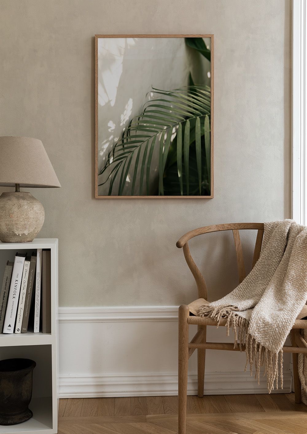 緑の葉が美しいトロピカルなポスターです。細長い葉が光と影を作り、穏やかで自然な雰囲気を感じられます。お部屋を明るく爽やかな空間に変えてくれるアートです。